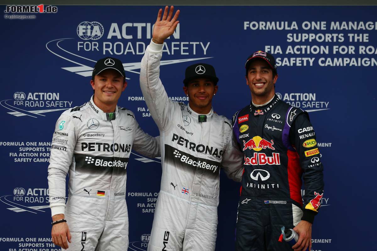 (Motorsport-Total.com) - Lewis Hamilton hat die Favoritenrolle von Mercedes im Qualifying zum Grand Prix von Australien perfekt umgesetzt. Der Formel-1-Weltmeister von 2008 sicherte sich am Samstag im Regen von Melbourne in 1:44.231 Minuten die erste Pole-Position des Jahres, knapp dahinter folgten Red-Bull-Neuzugang Daniel Ricciardo und Mercedes-Teamkollege Nico Rosberg. Hamilton feiert seine 32. Pole-Position, er hat somit in der Statistik zum berühmten Landsmann Nigel Mansell aufgeschlossen.