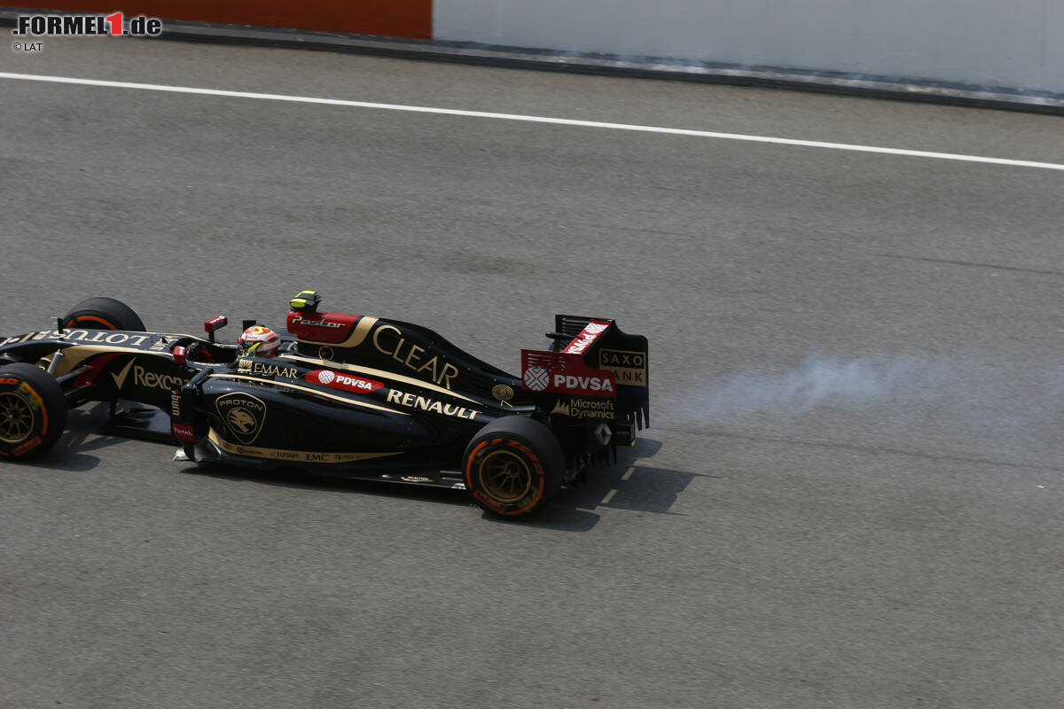 Ernüchternd, aber zumindest deutlich besser als am Vormittag verlief das zweite Freie Training für Lotus. Romain Grosjean (17./+2,622) und Pastor Maldonado schafften heute gemeinsam nur 20 Runden. Grosjean wurde am Nachmittag gleich zweimal mit Getriebeproblemen langsamer. Ein weiteres Renault-Opfer: Kamui Kobayashi (Caterham) musste die zweite Session wegen eines ERS-Problems sogar komplett streichen.