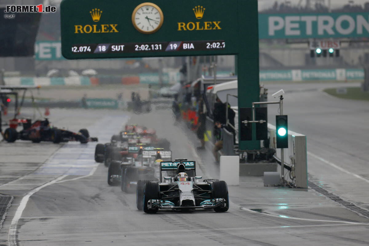 (Motorsport-Total.com) - Mercedes zeigte im Qualifying der Formel 1 zum Großen Preis von Malaysia in Sepang, dass der F1 W05 nicht nur im Trockenen, sondern auch bei Regen schnell ist. Bei durchweg nassen Bedingungen fuhr Lewis Hamilton im um 50 Minuten nach hinten verschobenen Qualifying mit einer Zeit von 1:59.431 Minuten auf Startplatz eins. Wie schon beim Saisonauftakt in Melbourne wird der Brite das Rennen damit von der Pole-Position starten.