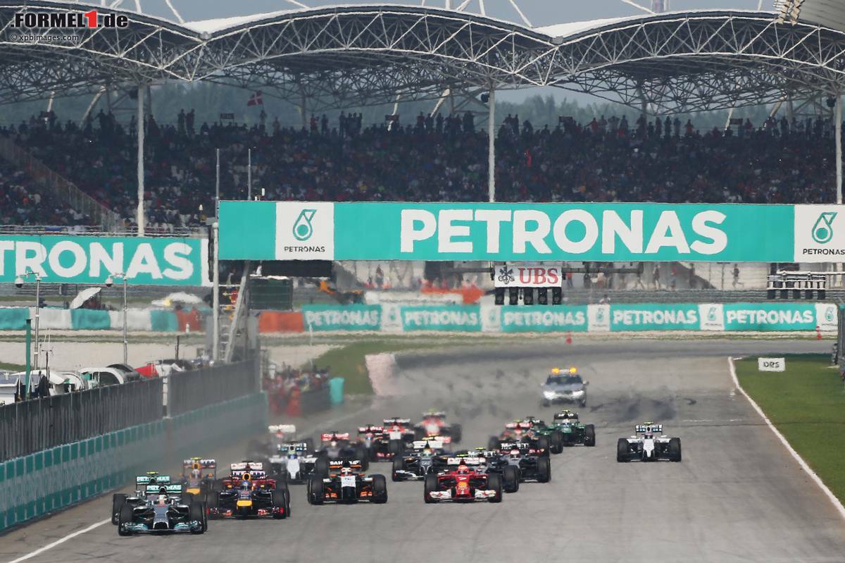 (Motorsport-Total.com) - Die Dominanz von Mercedes in der Formel-1-Saison 2014 war auch beim zweiten Rennen erdrückend: Lewis Hamilton sicherte sich beim Grand Prix von Malaysia mit einer souveränen Vorstellung den Sieg, 17,3 Sekunden vor seinem Teamkollegen Nico Rosberg und 24,5 Sekunden vor Red-Bull-Pilot Sebastian Vettel. Der möglicherweise einzige Gegner, der den Silberpfeilen wirklich hätte gefährlich werden können, blieb Sepang heute fern: der Regen.