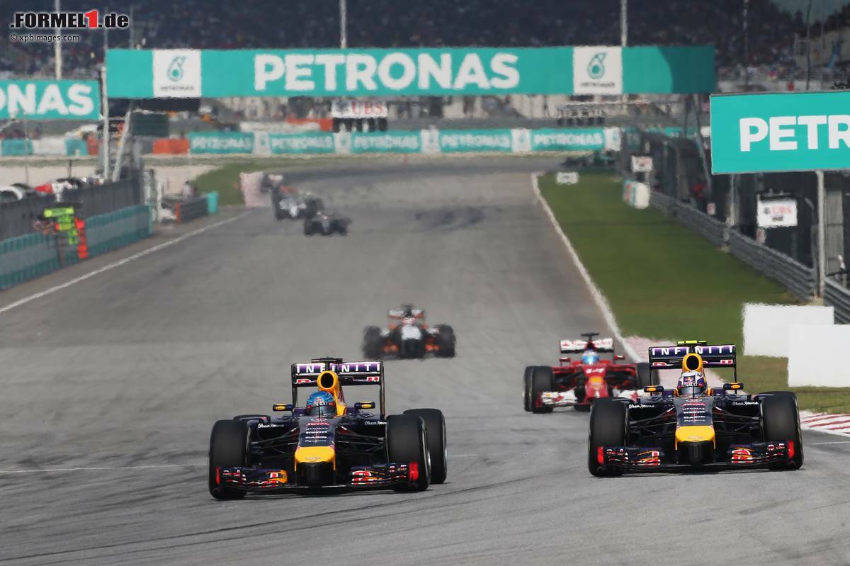 Dabei hatte Vettel keinen guten Start erwischt: Rosberg musste er schon vor der ersten Kurve durchlassen, Teamkollege Daniel Ricciardo nach sehenswertem Rad-an-Rad-Duell erst nach dem ersten Kurvenkomplex. In Runde vier war die gewohnte Hierarchie bei Red Bull aber wiederhergestellt - und auch als Ricciardo dank seines früheren ersten Boxenstopps noch einmal knapp an Vettel herankam, machte er keine Anstalten, etwas Riskantes zu versuchen.
