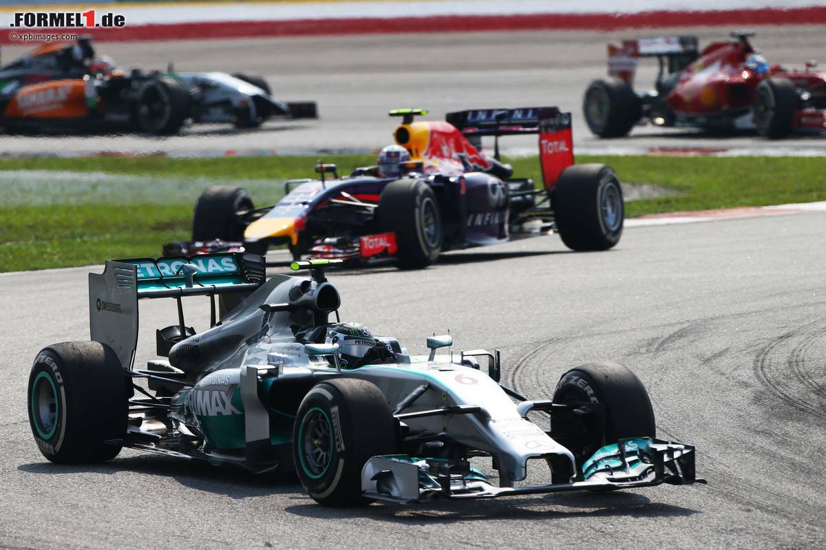 (Motorsport-Total.com) - Die Dominanz von Mercedes in der Formel-1-Saison 2014 war auch beim zweiten Rennen erdrückend: Lewis Hamilton sicherte sich beim Grand Prix von Malaysia mit einer souveränen Vorstellung den Sieg, 17,3 Sekunden vor seinem Teamkollegen Nico Rosberg und 24,5 Sekunden vor Red-Bull-Pilot Sebastian Vettel. Der möglicherweise einzige Gegner, der den Silberpfeilen wirklich hätte gefährlich werden können, blieb Sepang heute fern: der Regen.