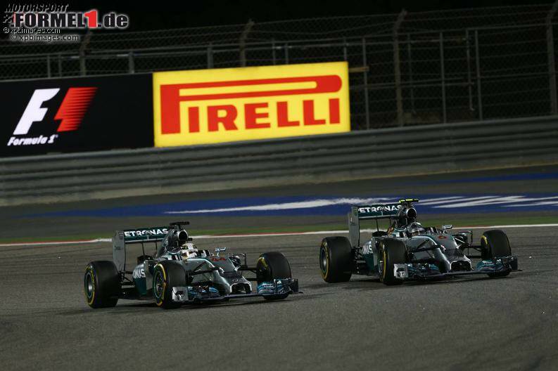 (Motorsport-Total.com) - Welch ein Duell zwischen den beiden Mercedes-Piloten Lewis Hamilton und Nico Rosberg im Kampf um den Sieg beim Grand Prix von Bahrain! Die beiden aus Startreihe eins losgefahrenen Silberpfeil-Piloten schenkten sich im Verlauf der 57 Rennrunden unter Flutlicht nichts. Mehrfach wechselte die Führung auf der Strecke, es wurde mit harten, aber fairen Bandagen gekämpft. Zuweilen wurde es richtig eng, doch es ging letztlich alles gut.