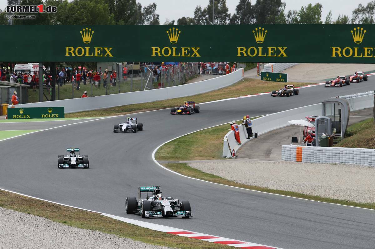 (Motorsport-Total.com) - Die Siegesserie von Mercedes in der Formel 1 geht weiter: Lewis Hamilton feierte beim Grand Prix von Spanien in Barcelona seinen vierten Erfolg hintereinander und fixierte damit auch den vierten Silberpfeil-Doppelsieg im fünften Saisonrennen. Nico Rosberg musste sich erneut geschlagen geben, lieferte seinem britischen Teamkollegen aber einen harten Kampf und hatte letztendlich nur um 0,6 Sekunden das Nachsehen. Alle anderen waren zu Statisten degradiert: Daniel Ricciardo (Red Bull) hatte als erster Mercedes-Verfolger schon 49,0 Sekunden Rückstand.