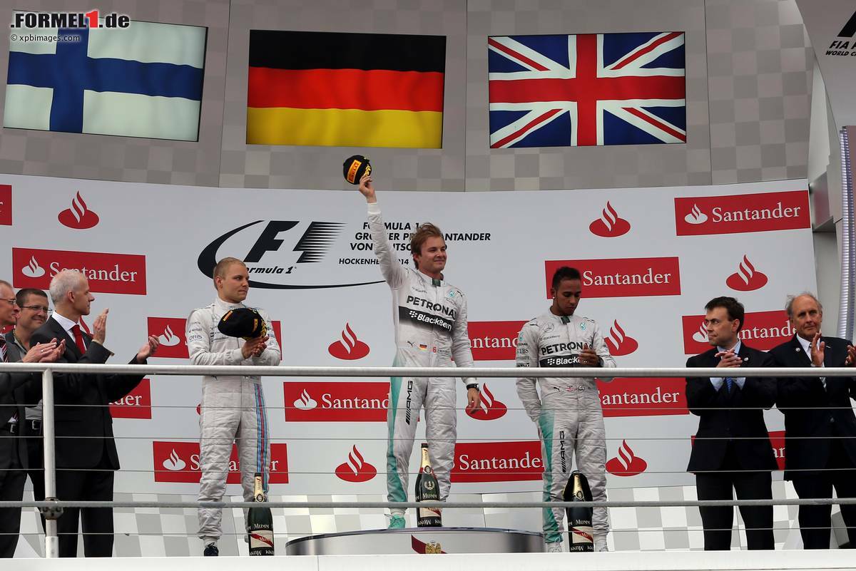 (Motorsport-Total.com) - Das deutsche Sport-Sommermärchen findet nach dem Fußball auch bei der Formel 1 seine Fortsetzung: Nico Rosberg sicherte sich heute den Sieg bei seinem Heimrennen in Hockenheim. Der Mercedes-Pilot gewann den (durchgehend trockenen) Grand Prix von Deutschland von der Pole-Position aus mit einer souveränen Leistung vor Valtteri Bottas (Williams) und Lewis Hamilton (Mercedes).