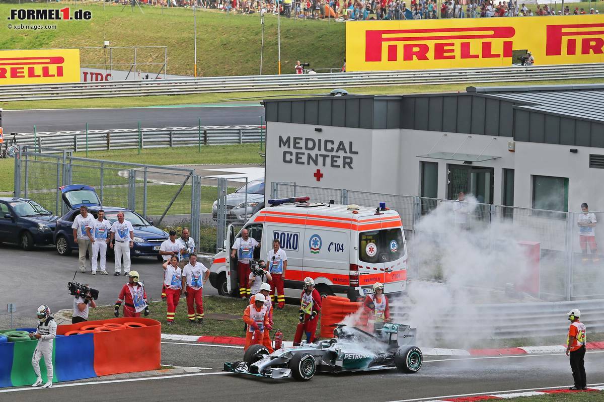 Nachdem Hamilton die drei Freien Trainings auf dem Hungaroring allesamt für sich entschieden hatte, ereilte ihn im ersten Qualifying-Segment (Q1) wieder einmal großes Pech. Diesmal war es kein technisch bedingter Abflug wie vor einer Woche in Hockenheim, sondern ein unter Flammenentwicklung geschehenes Ausrollen seines Silberpfeils. Was war passiert?