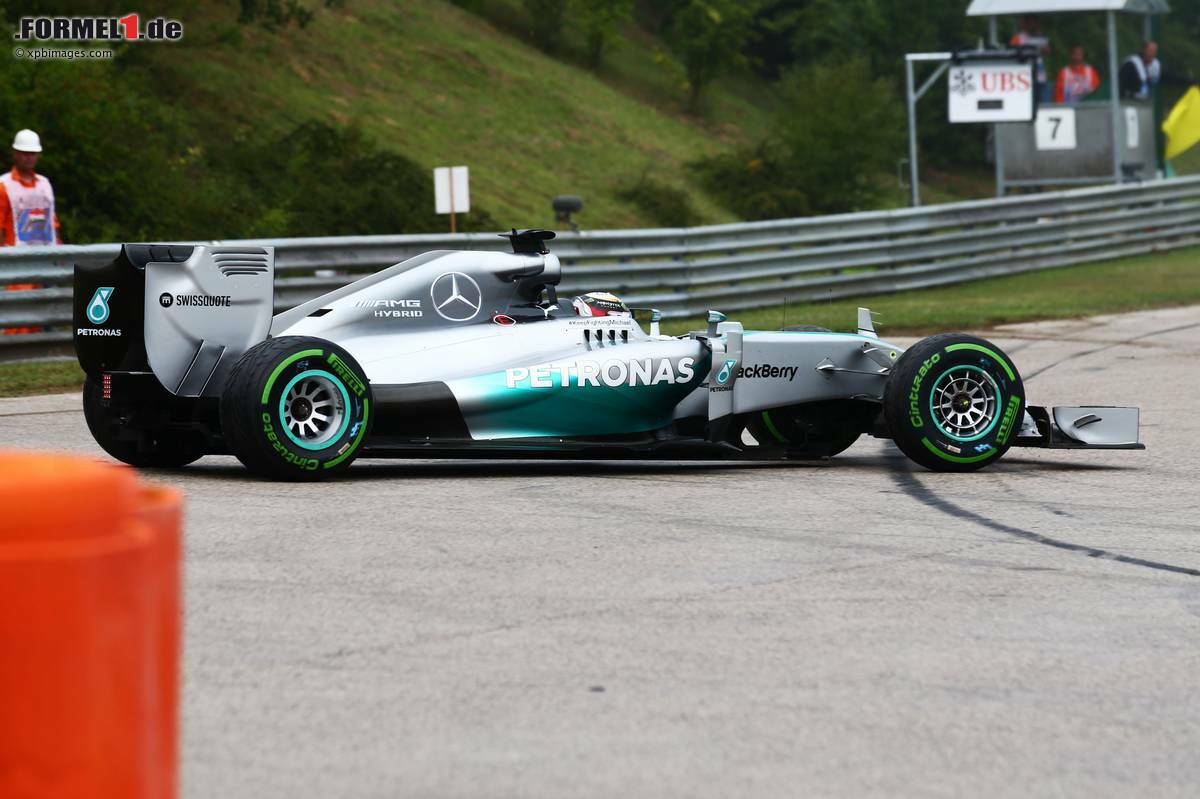 Dabei hatte er den Grand Prix zu Beginn noch souverän angeführt. Nach dem Start auf Intermediates fuhr Rosberg seinen Verfolgern Valtteri Bottas (Williams), Vettel und Alonso auf und davon - nach acht Runden hatte er schon neun Sekunden Vorsprung. Hamilton lag zu diesem Zeitpunkt mit fast einer halben Minute Rückstand an 13. Position, obwohl er nach Start aus der Boxengasse gleich mal leicht gecrasht war. Der Silberpfeil überstand diese Situation unbeschadet.