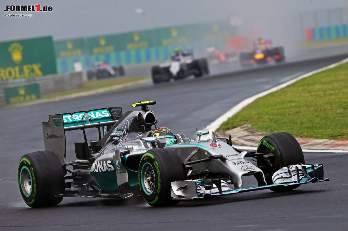 Dabei hatte er den Grand Prix zu Beginn noch souverän angeführt. Nach dem Start auf Intermediates fuhr Rosberg seinen Verfolgern Valtteri Bottas (Williams), Vettel und Alonso auf und davon - nach acht Runden hatte er schon neun Sekunden Vorsprung. Hamilton lag zu diesem Zeitpunkt mit fast einer halben Minute Rückstand an 13. Position, obwohl er nach Start aus der Boxengasse gleich mal leicht gecrasht war. Der Silberpfeil überstand diese Situation unbeschadet.