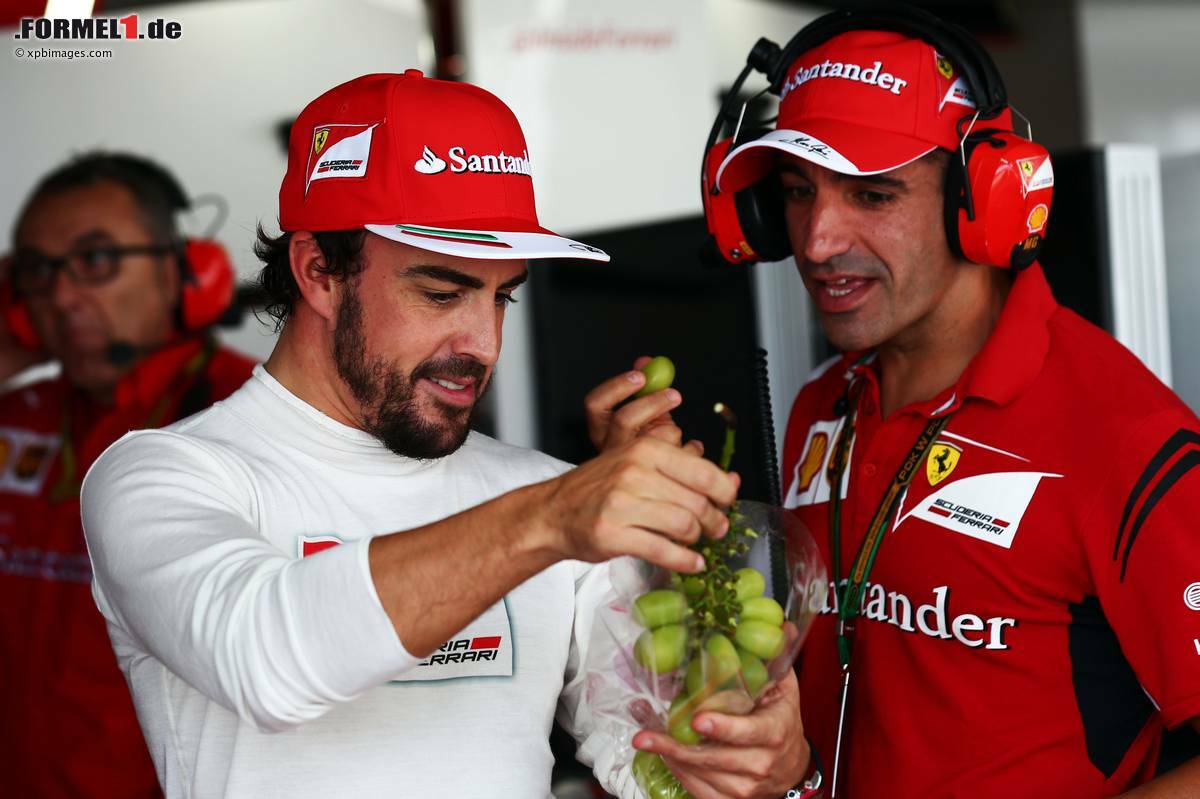 ...seinem Teamkollegen Fernando Alonso zu finden, der um 1,559 Sekunden langsamer war. Hier probiert er japanische Trauben mit Testfahrer Marc Gene.