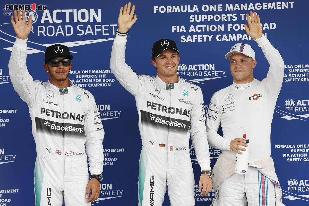 Erster Verfolger der beiden war in allen drei Segmenten Valtteri Bottas, dessen Williams-Team an diesem Wochenende von aerodynamischen Neuerungen profitiert. Dem Finnen fehlten schon in Q1 sieben Zehntelsekunden, am Ende waren es dann 0,622 Sekunden. Damit steht er unmittelbar vor Teamkollege Felipe Massa, der um vier Zehntelsekunden langsamer war. Aber: Williams bekennt sich offen dazu, auf eine Trockenabstimmung gesetzt zu haben.