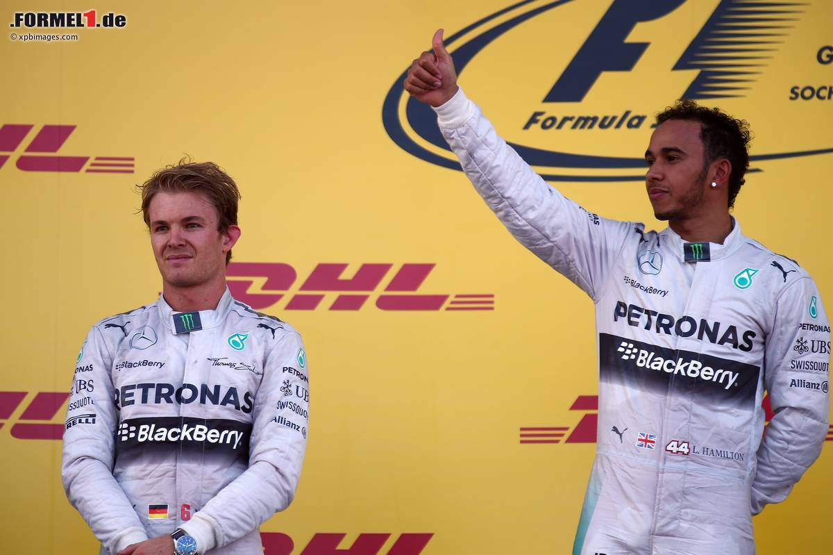 (Motorsport-Total.com) - Wladimir Putin setzte alles daran, eine goldene Rennpremiere in Sotschi zu inszenieren. Auf dem Podium musste der Präsident Russlands mit viel Silber vorliebnehmen. Rennsieger Lewis Hamilton und Teamkollege Nico Rosberg bejubelten nicht nur einen weiteren Doppelerfolg, sondern auch den vorzeitigen Gewinn der Konstrukteurs-WM durch Mercedes. Der Brite sprudelte vor Freude, schließlich baute er seine Führung im Fahrerchampionat aus: "Ich bin so glücklich, dass ich hier oben stehen darf", so Hamilton.