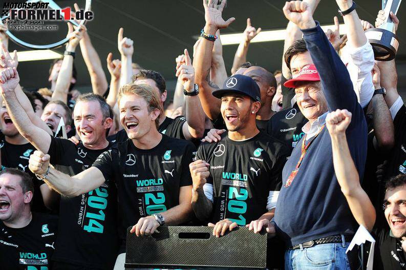 Auch Toto Wolff strahlt bis über beide Ohren: "Als Automobil-Hersteller sind wir jetzt die Besten der Welt", freut sich der Österreicher bei 'Sky', weiß aber mit Blick auf vier Jahre Aufbauarbeit und einem Dank an Urvater Ross Brawn noch hinzuzufügen: "Es war eine schwierige Reise. Das Team hat so stark zusammengehalten, und auch in diesem Jahr hatten wir Höhen und Tiefen." Auch Nico Rosberg, Puzzleteil des Erfolges, hat ein Gespür dafür, dass sich ein historischer Moment ereignet.