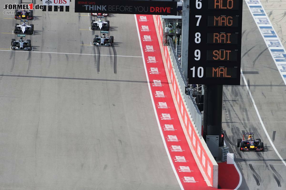 Das Überholmanöver von Vergne gegen die beiden Lotus in Kurve 1 war ebenfalls couragiert, aber auch so hart, dass es von der Rennleitung noch untersucht wird. Und Daniil Kwjat (Toro Rosso) erlebte seine ganz persönliche Schrecksekunde, als er in der Schlussphase funkte: "Ich kann nicht mehr lenken!" Trotzdem kam er als 15. und Letzter in die Wertung. Insgesamt waren, in Abwesenheit von Marussia und Caterham, 18 Autos in den Grand Prix der USA gestartet.