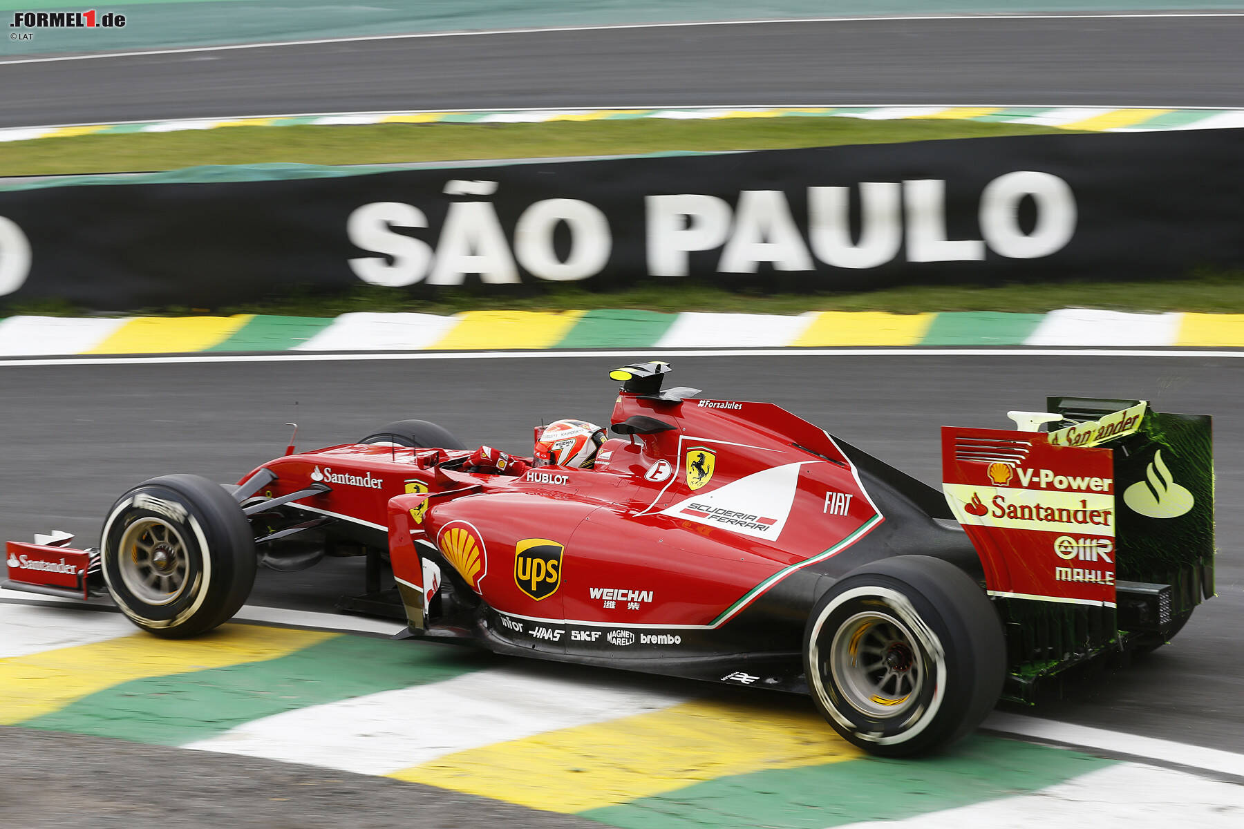 (Motorsport-Total.com) - Überraschung bei Ferrari: Nicht wie gewohnt Fernando Alonso, sondern der von Dauerproblemen mit dem F14 T geplagte Kimi Räikkönen hatte im Freien Training von Sao Paulo am Freitag teamintern die Nase vorne. Der Finne war im Gesamtergebnis der beiden Sessions dank einer persönlichen Bestzeit in 1:12.696 Minuten (+0,573 Sekunden) Dritter. Der Spanier (1:13.122 Minuten; +0,999 Sekunden) kam über den sechsten Rang nicht hinaus, hatte aber auch technische Schwierigkeiten.