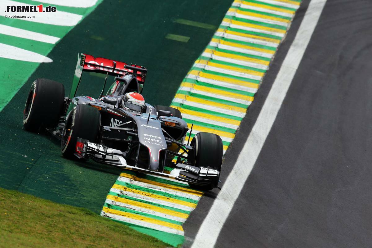 (Motorsport-Total.com) - Das Freie Training zum Brasilien-Grand-Prix verlief für die Sauber-Piloten sehr unterschiedlich. Während Adrian Sutil sein geplantes Programm abarbeitete, hatte Esteban Gutierrez technische Probleme zu beklagen. Der Mexikaner verlor Zeit und absolvierte in der ersten Session nur sechs Runden. Am Ende stand für Gutierrez trotzdem Rang 15 (1:13.902 Minuten; +1,779 Sekunden) zu Buche, während Sutil (1:14.204 Minuten; +2,081 Sekunden) über den 16. Platz nicht hinauskam.