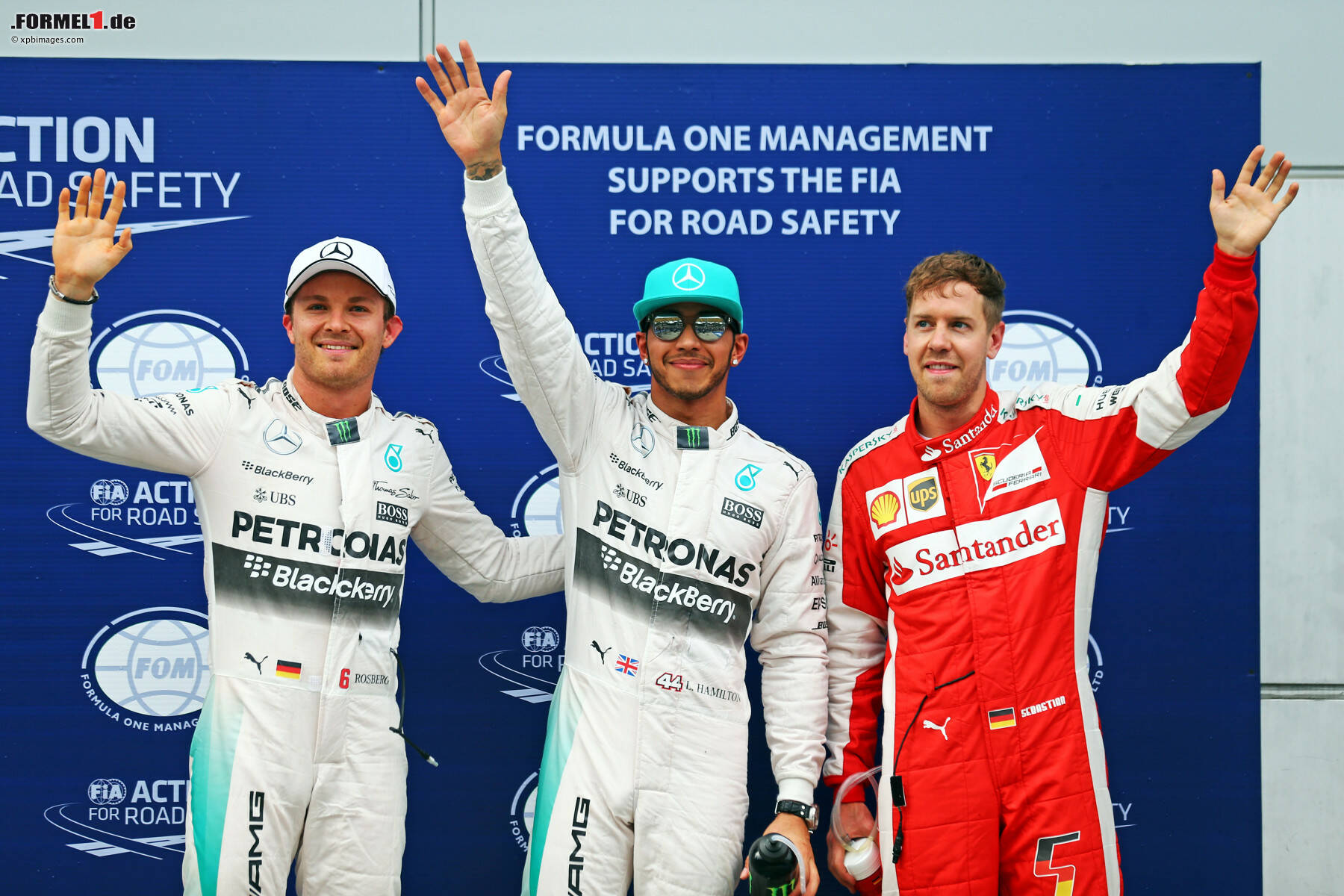 (Motorsport-Total.com) - Neunmal hintereinander erstrahlte die erste Startreihe bei einem Formel-1-Rennen komplett in Mercedes-Silber, aber diese Serie ist heute in Sepang zu Ende gegangen. Sebastian Vettel (Ferrari) sicherte sich in einem chaotischen Regen-Qualifying zum Grand Prix von Malaysia (Formel 1 live im Ticker) überraschend den zweiten Platz vor Landsmann Nico Rosberg (Mercedes). Vorjahressieger und Titelverteidiger Lewis Hamilton (Mercedes) fuhr ungefährdet auf die Pole-Position.