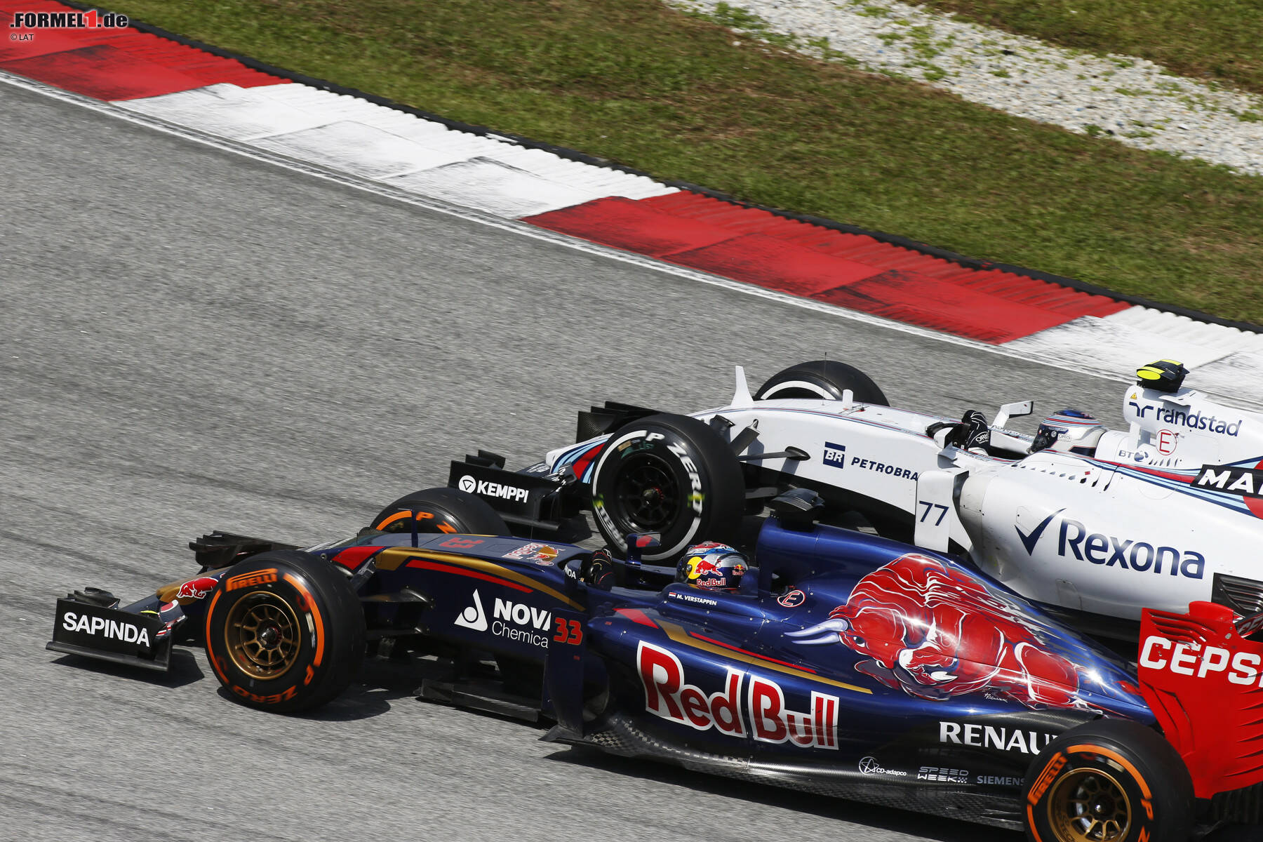Siebter wurde Max Verstappen, ebenfalls mit einem späten Überholmanöver gegen seinen Toro-Rosso-Teamkollegen Carlos Sainz, der nach der Safety-Car-Phase hinter Vettel, Hülkenberg und Grosjean an vierter Stelle gelegen war. Verstappen war in Sepang aber der aggressivere Fahrer, zeigte die eine oder andere beherzte Attacke - und sorgte beinahe für einen Herzstillstand bei Papa Jos, als er in der Boxeneinfahrt in die Wiese ausritt.