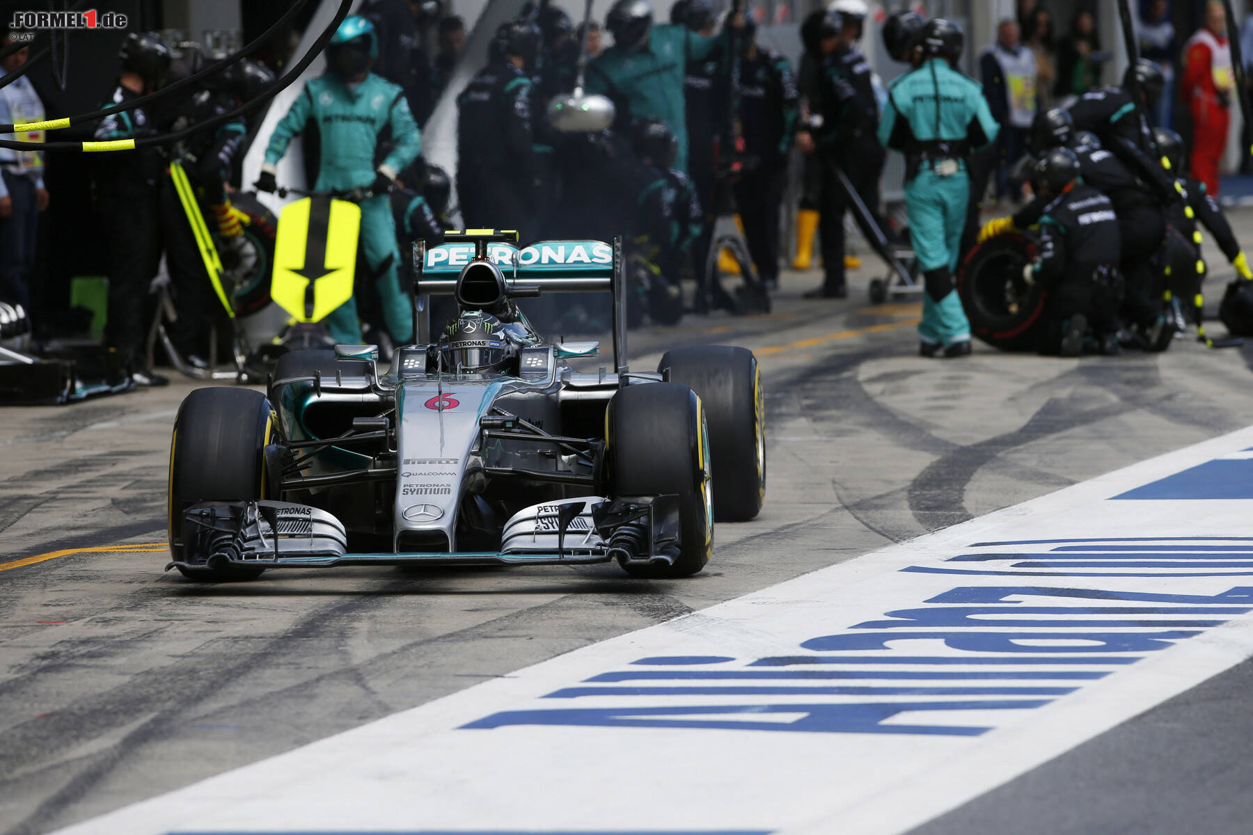 Haarige Boxeneinfahrt für Rosberg, der im Kampf um den Sieg mit dem Messer zwischen den Zähnen auf der letzten Rille bremst, aber gerade noch das Boxengassen-Speedlimit einhalten kann. Der Stopp selbst klappt dann problemlos, die Führung (davor eineinhalb Sekunden) ist nicht in Gefahr. Auch, weil Hamilton beim Rausfahren aus der Box die weiße Linie überfährt und sich damit eine Fünf-Sekunden-Strafe einhandelt.