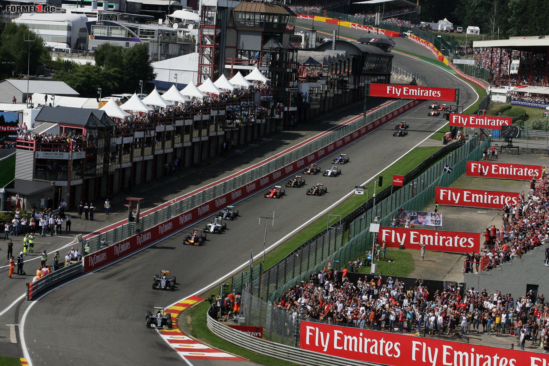 Für Hamilton gab es an einem ungewöhnlich unspektakulären Nachmittag in den Ardennen nur zwei Gefahrenpotenziale: erstens die erste Runde, in der er seine Führung vor Les Combes nur mit Mühe gegen Sergio Perez (Force India) verteidigen konnte, und zweitens der Regenschauer, der wenige Minuten vor Rennende 40 Kilometer von Spa-Francorchamps entfernt war. Aber am Ende setzte er sich sicher durch, zwei Sekunden vor Teamkollege Nico Rosberg und 37,9 vor Romain Grosjean (Lotus).