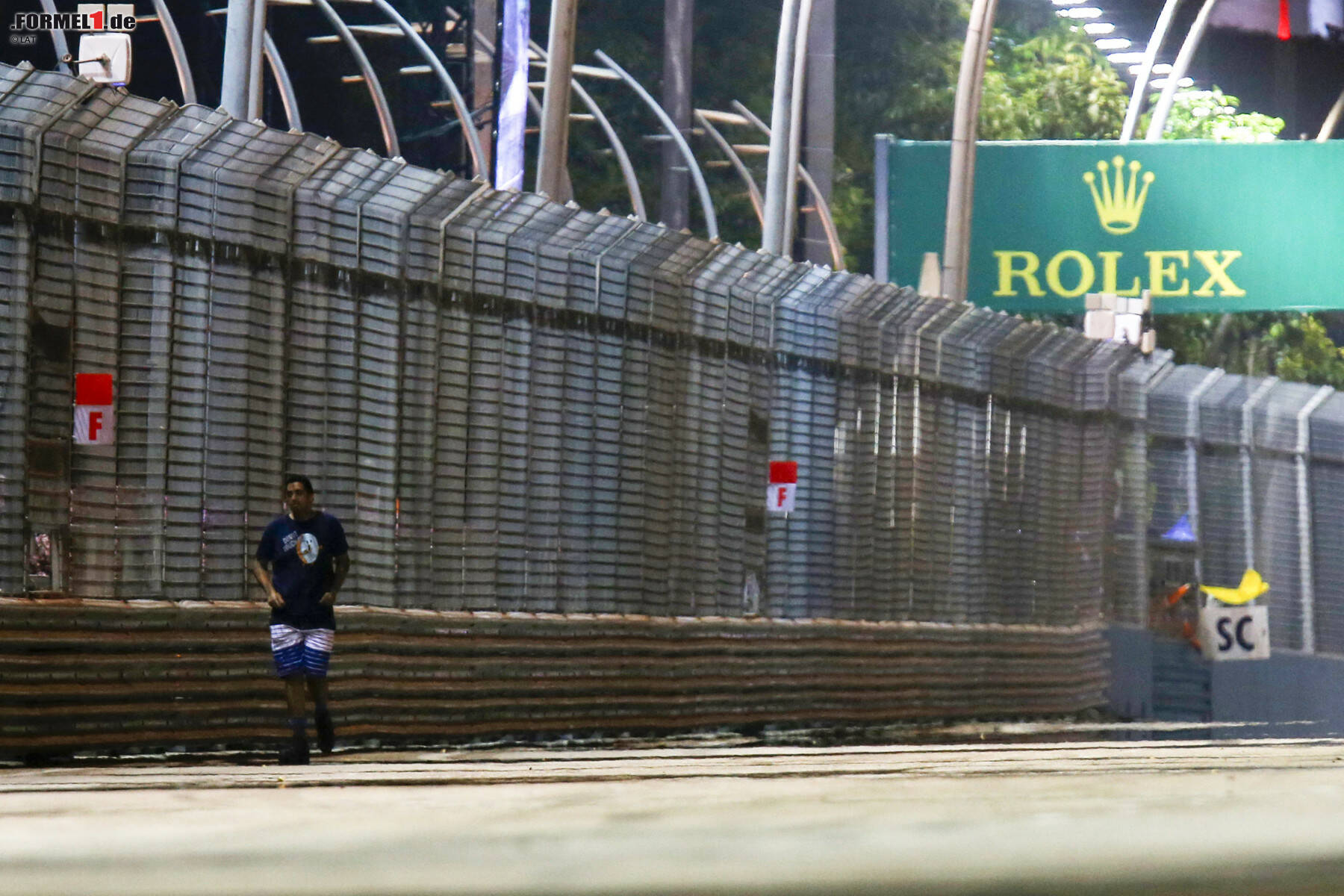 Für die größte Schrecksekunde im Rahmen der Vettel-Galavorstellung sorgte ein Verrückter, der sich kurz nach Rennhalbzeit einen Weg über die Absperrung bahnte und plötzlich auf der Strecke auftauchte. An einer Stelle, an der die Autos mit weit über 200 km/h vorbeidonnern, spazierte der Mann seelenruhig über die Fahrbahn, kletterte anschließend aber ohne ein Eingreifen der Streckenposten wieder hinter die Leitplanke. Die Rennleitung schickte sicherheitshalber das Safety-Car auf die Strecke.