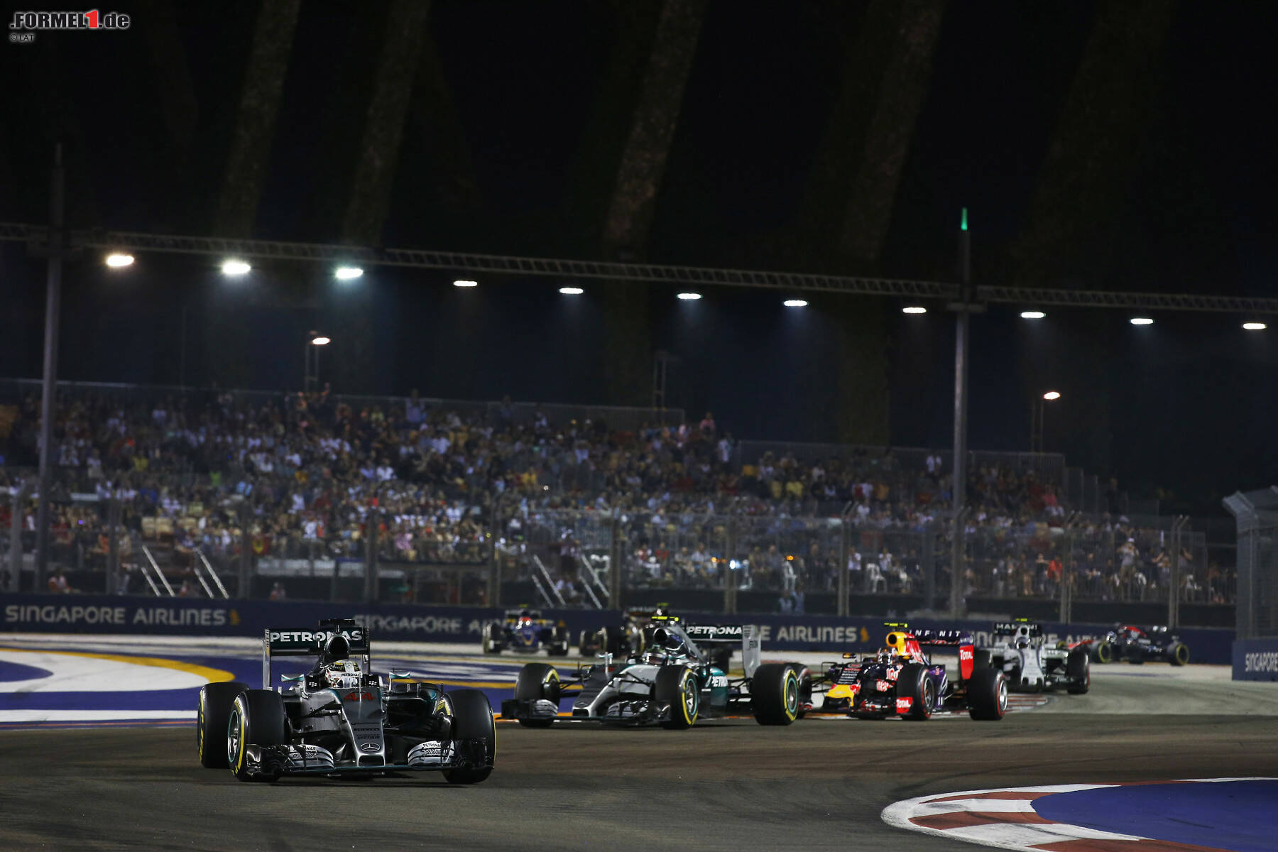 Nico Rosberg im Mercedes folgte mit großem Abstand auf dem vierten Rang, hatte in Singapur jedoch ein deutlich turbulenteres Rennen zu verzeichnen als die Konkurrenz. Genau wie Lewis Hamilton kämpfte der Wiesbadener in der Vorstartphase mit Elektronikproblemen, die schnell behoben waren. Anschließend verteidigte er trotz des Drucks durch Valtteri Bottas (Williams) den sechsten Platz und schob sich mit einem Boxenstopp unter dem Virtuellen Safety-Car vorbei an Daniil Kwjat (Red Bull).