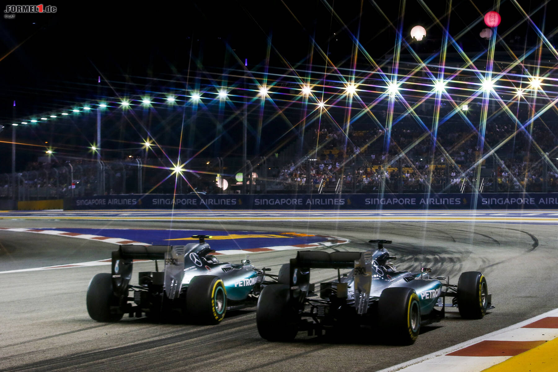 Nico Rosberg im Mercedes folgte mit großem Abstand auf dem vierten Rang, hatte in Singapur jedoch ein deutlich turbulenteres Rennen zu verzeichnen als die Konkurrenz. Genau wie Lewis Hamilton kämpfte der Wiesbadener in der Vorstartphase mit Elektronikproblemen, die schnell behoben waren. Anschließend verteidigte er trotz des Drucks durch Valtteri Bottas (Williams) den sechsten Platz und schob sich mit einem Boxenstopp unter dem Virtuellen Safety-Car vorbei an Daniil Kwjat (Red Bull).