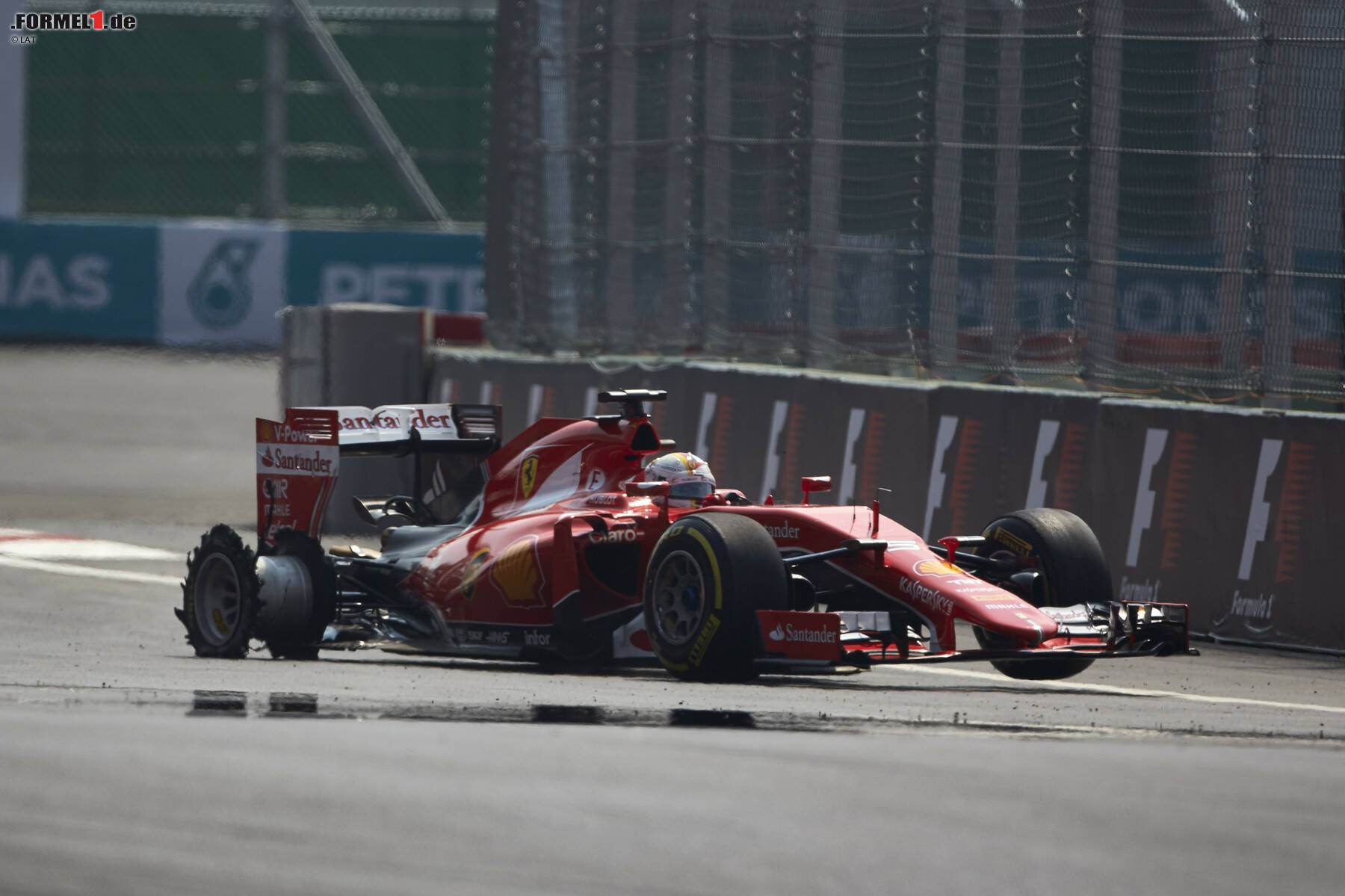 "Es war ein bisschen der Wurm", beklagt Vettel. "Da war eigentlich das Rennen schon gelaufen." Im Anschluss patzte der Ex-Weltmeister selbst: Er leistete sich zwei Fahrfehler, bei denen er den Ferrari in die Auslaufzone respektive auf den Randstein setzte und fing sich einen Bremsplatten ein. Dann der große Knall: Wie zuvor verlor Vettel in der 52. Runde in Kurve 7 die Kontrolle über sein Auto, knallte in die Streckenbegrenzung und musste aus seinem beschädigten Wagen aussteigen.