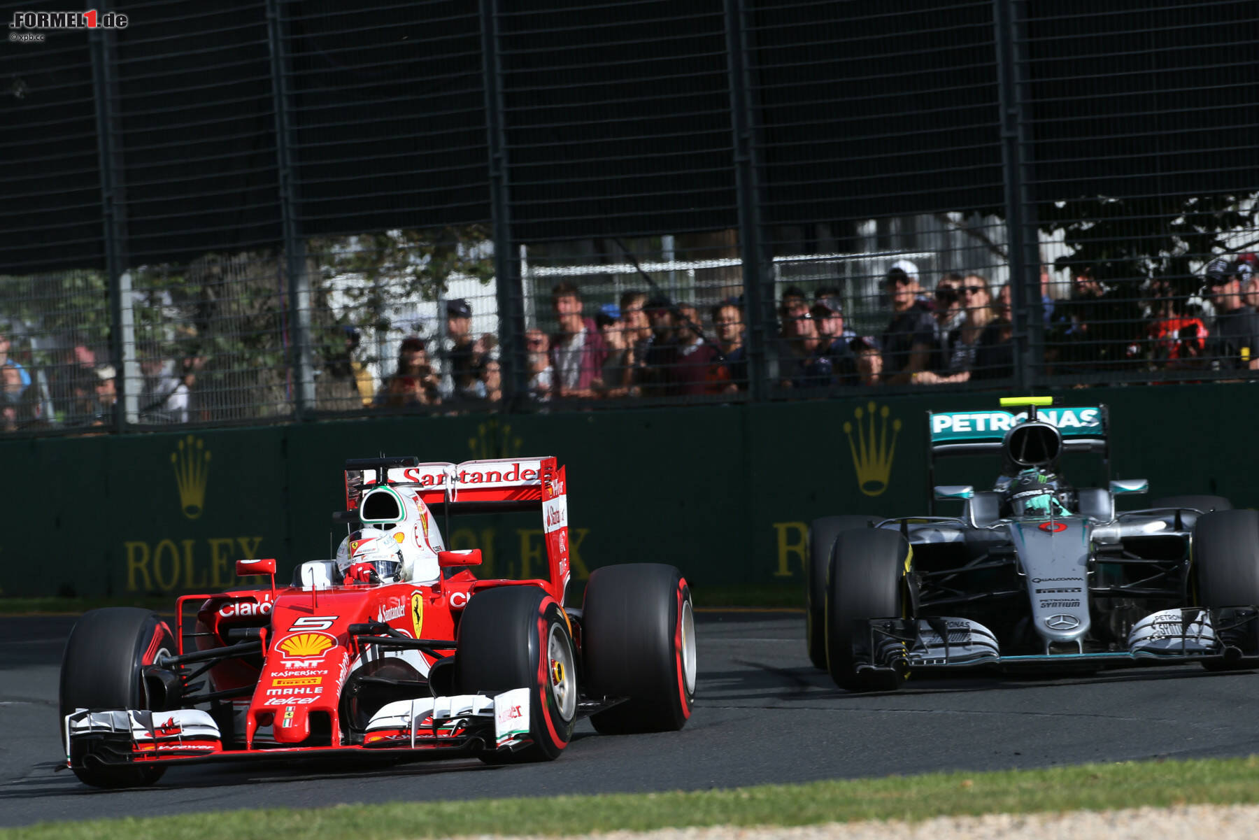 Nur eine Runde später wechselt Vettel die Reifen, und dass der Ferrari-Pilot zwei Zehntelsekunden weniger an der Box verliert, rettet ihn gegen den versuchten Rosberg-Undercut. Vettel bleibt auf Supersoft, Rosberg ist jetzt auf Medium unterwegs - weswegen der Abstand natürlich relativ schnell anwächst.
