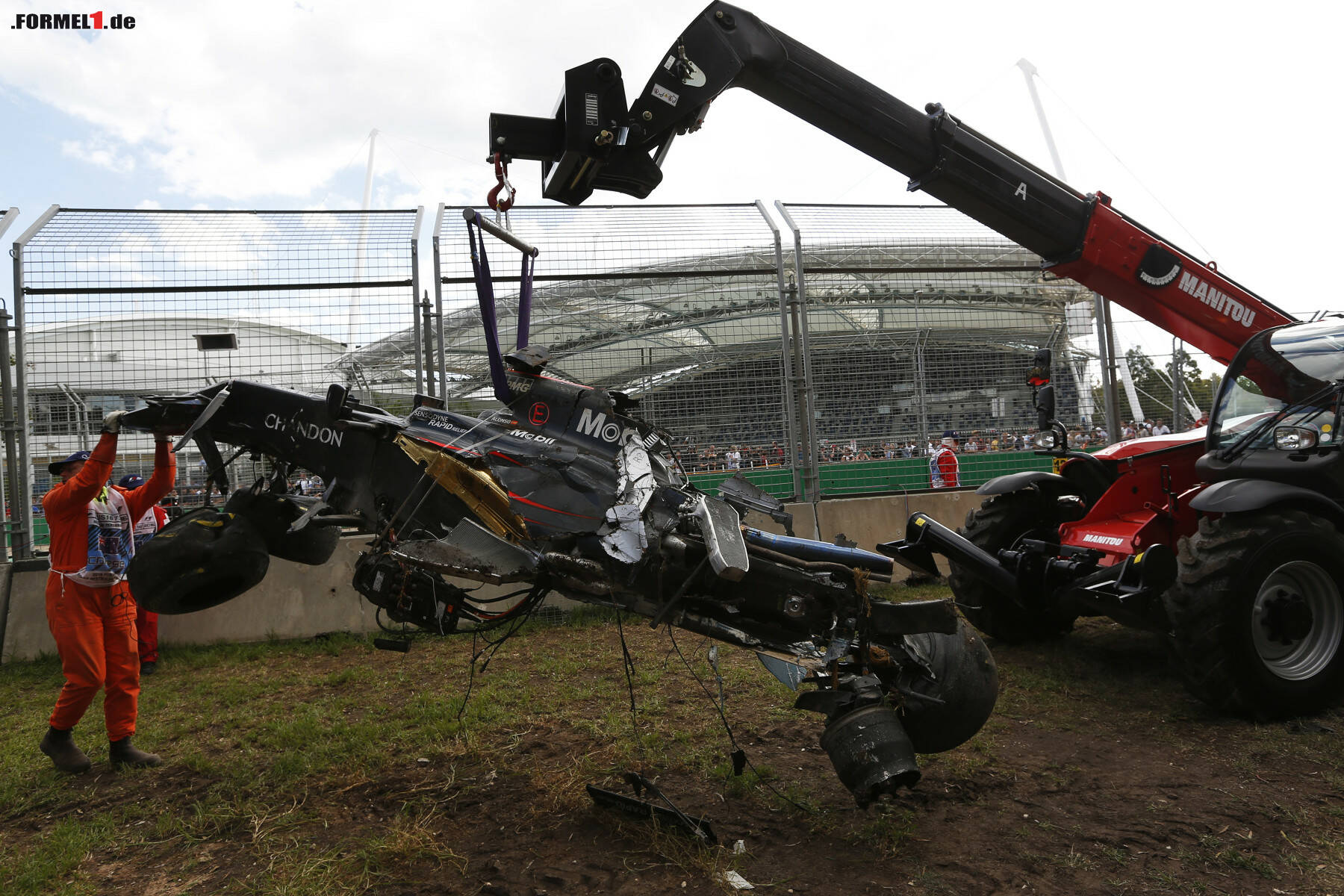 In Runde 17 des Saisonauftakts hält die Formel 1 den Atem an: Von Fernando Alonsos McLaren ist nur noch Schrott übrig. Doch was ist passiert? Fotostrecke