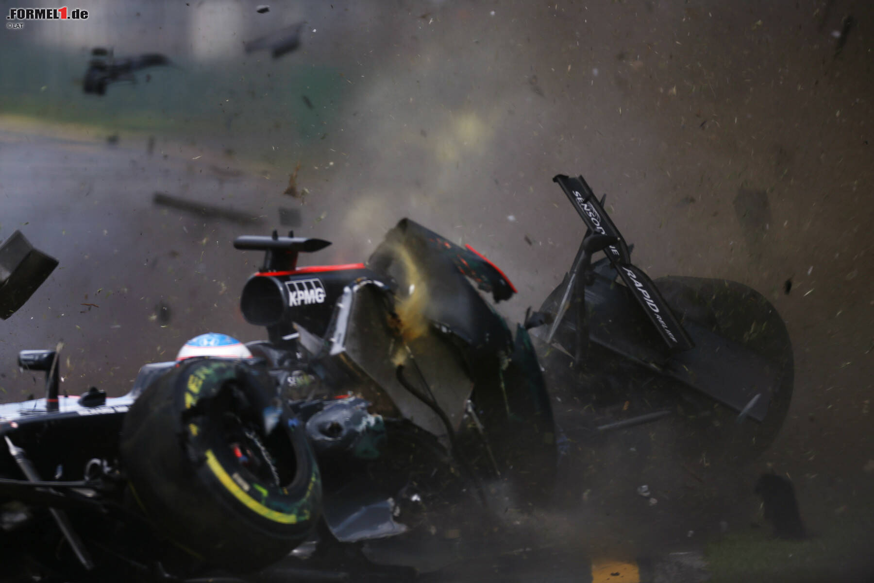 Der McLaren schießt ins Kiesbett. Durch die Rollbewegung überschlägt sich der McLaren und prallt mit hoher Geschwindigkeit in die Mauer.