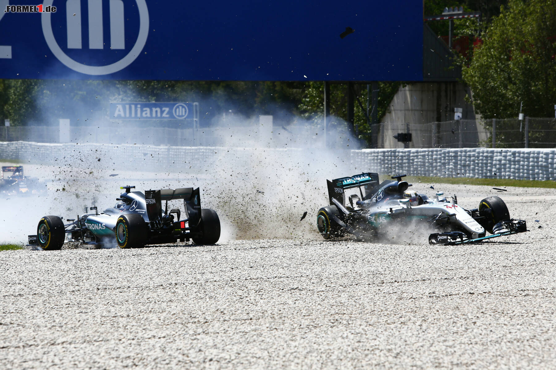 Katastrophe für Mercedes in Barcelona: Nur vier Kurven dauert es, bis die beiden führenden Silberpfeile im Kies stehen. Es ist die erste verheerende Kollision zwischen Nico Rosberg und Lewis Hamilton seit Spa 2014.