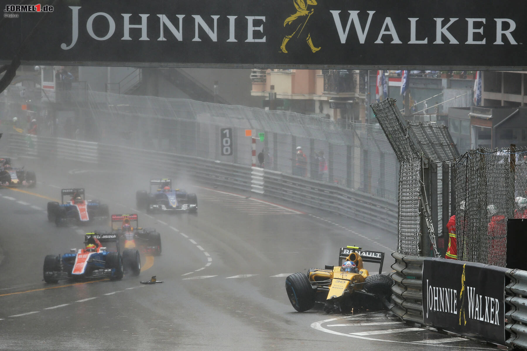 Gleich beim "Restart" (in Runde acht) steigt Jolyon Palmer zu ambitioniert aufs Gas, noch dazu auf einer weißen Linie. Der Renault gerät außer Kontrolle (nicht zum ersten Mal an diesem Wochenende) und rutscht mit hoher Geschwindigkeit in Richtung Sainte Devote, ...