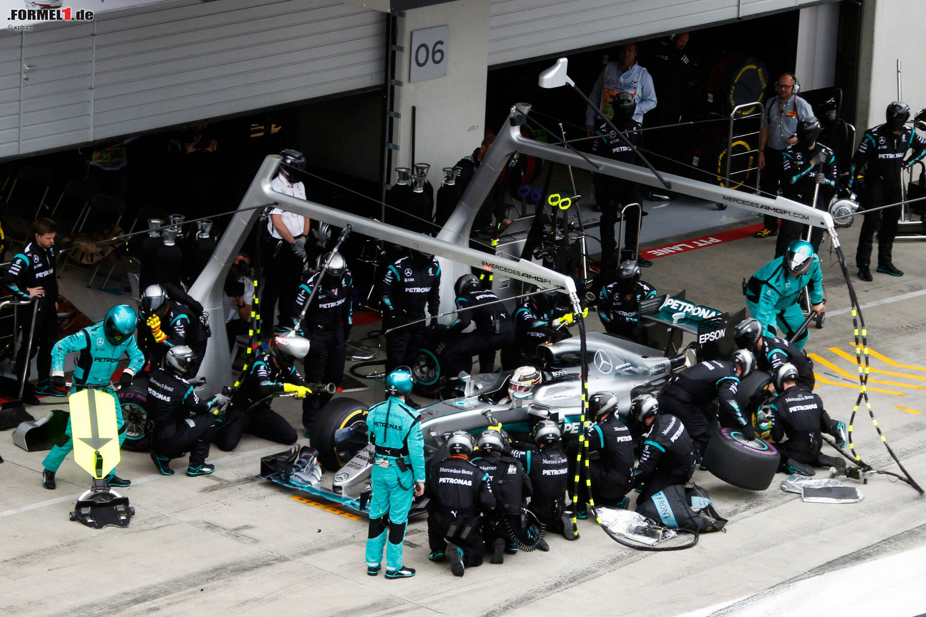 Trotzdem läuft das Rennen für ihn: Auch weil bei Hamiltons Boxenstopp ein Hinterrad klemmt, kommt dieser 2,5 Sekunden hinter Rosberg wieder auf die Strecke. Die Ferraris, die noch nicht an der Box waren, haben kurzzeitig eine Doppelführung: Räikkönen 5,5 Sekunden vor Sebastian Vettel.