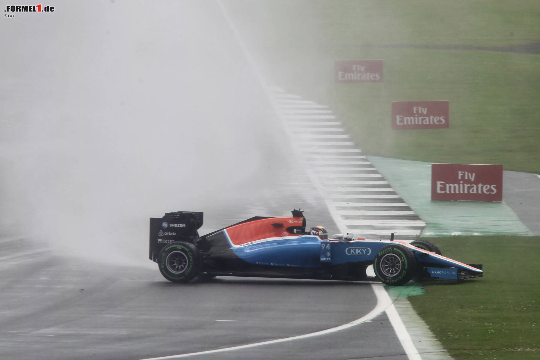 Mercedes nutzt eine virtuelle Safety-Car-Phase für den ersten Reifenwechsel. Ausgelöst wird diese von Pascal Wehrlein. Der Rookie fliegt mit den Regenreifen einfach ab - und macht mangelnde Erfahrung unter solchen Bedingungen für seinen Dreher verantwortlich. Rio Haryanto passiert später fast das gleiche Missgeschick.