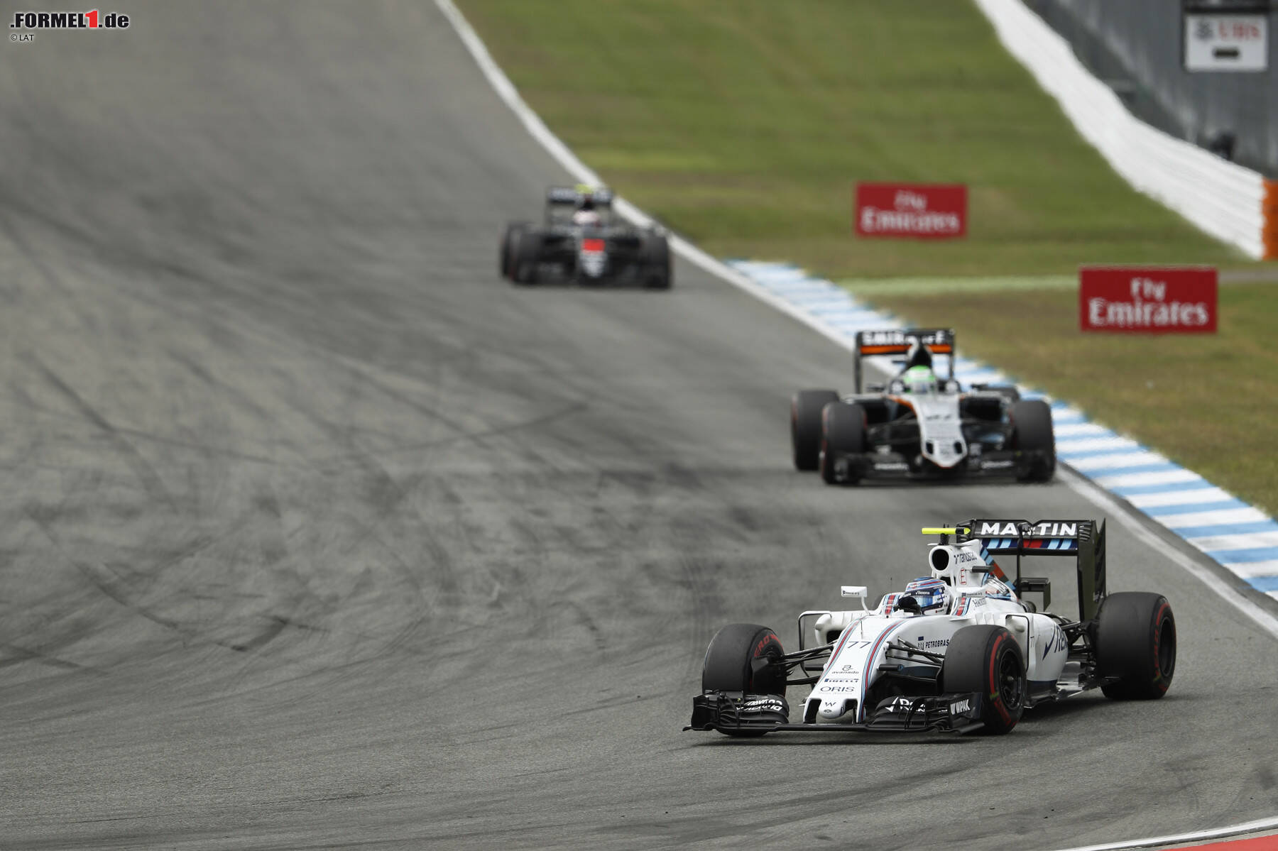 Lange sieht es so aus, als würde Valtteri Bottas als Siebter ins Ziel kommen. In Runde 46 hat Nico Hülkenberg noch 16,3 Sekunden Rückstand auf den Williams-Fahrer, dessen Reifen haben bei der Zieldurchfahrt aber 33 Runden drauf - zu viel. So schlüpft nicht nur Hülkenberg durch, sondern auch Jenson Button.