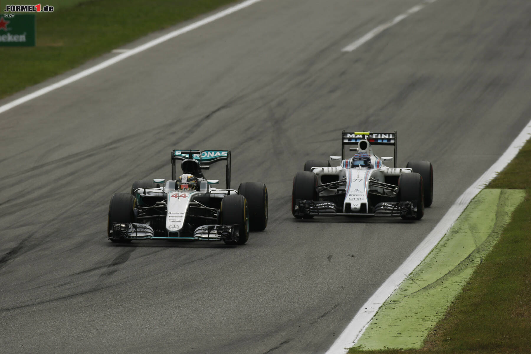 Mit Mercedes-Power im Heck ist der Bottas-Williams keine leichte Kost für Hamilton. Es dauert bis zur elften Runde, ehe er vorbeikommt und P4 einnimmt, und selbst da braucht's ein smartes, schon in der Parabolica angetragenes Manöver. Endlich vorbei, fehlen auf Rosberg bereits 11,0 Sekunden.