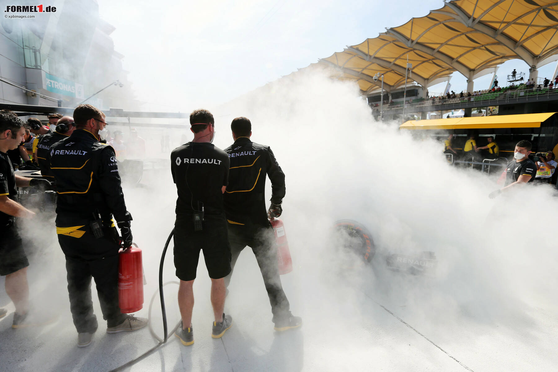 Die Truppe wollte in Sepang bei Magnussens Auto ein für Mexiko optimiertes Benzinsystem testen. Auf über 2.000 Metern Höhe ist die Luft bekanntlich deutlich dünner als in Sepang. Doch offenbar hatten die Ingenieure die Angelegenheit nicht zu Ende gedacht. Weil der Druck im Tank zu groß war, drang über ein Entlüftungsventil nicht Luft, sondern Benzin über ein kleines Loch auf der Airbox nach draußen. Der feine Benzinstrahl, der an der Verkleidung herunterrann, fing Feuer.