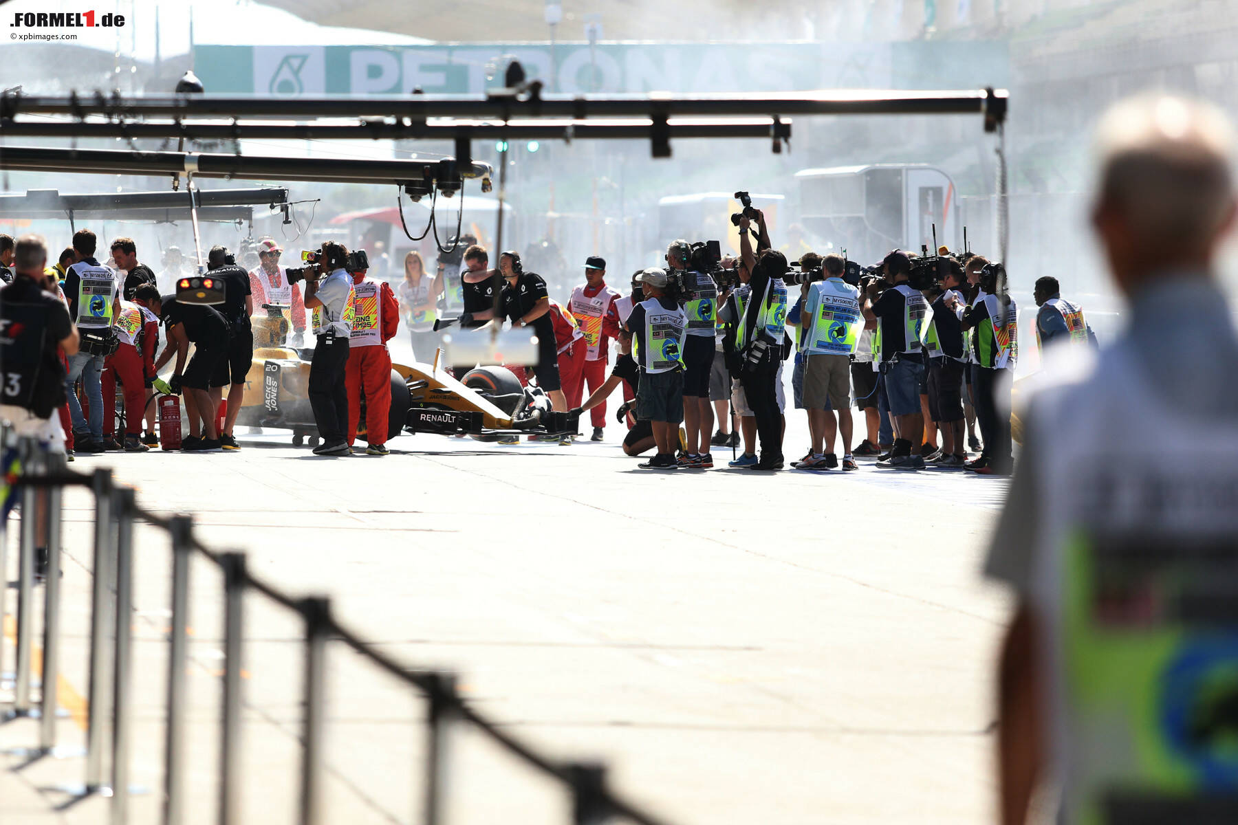 (Motorsport-Total.com) - The World's hottest race! Der Slogan des Grand Prix von Malaysia wurde für Kevin Magnussen schon nach wenigen Minuten des ersten Trainings in Sepang (hier geht's zum Trainingsbericht) zur dramatischen Realität: Der Däne war gerade nach zwei Installationsrunden an die Box gekommen, als Flammen aus der Airbox züngelten. Bereits vor dem warnenden Funkspruch sprang Magnussen aus seinem Boliden, der danach trotz einer siebenminütigen Löschaktion ein kompletter Raub der Flammen wurde und abbrannte.