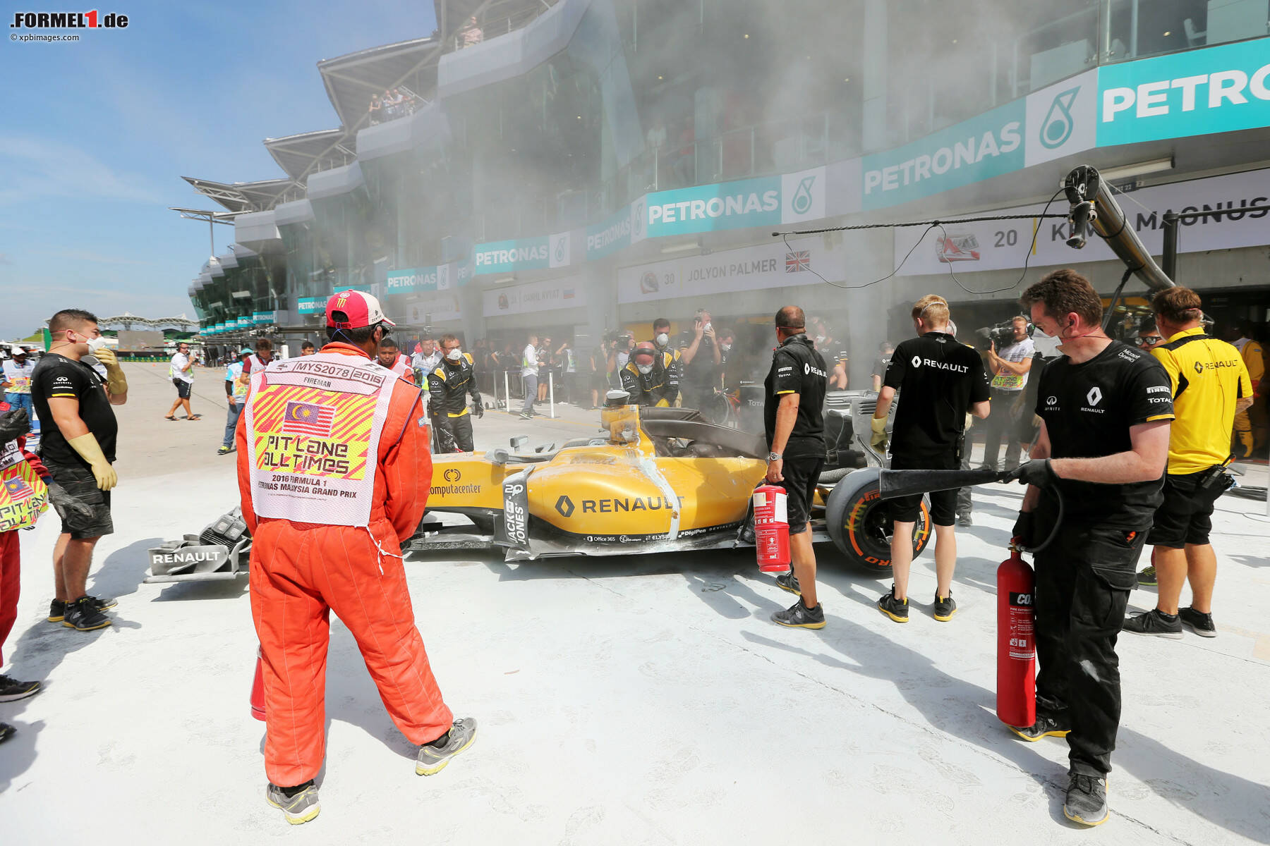 (Motorsport-Total.com) - The World's hottest race! Der Slogan des Grand Prix von Malaysia wurde für Kevin Magnussen schon nach wenigen Minuten des ersten Trainings in Sepang (hier geht's zum Trainingsbericht) zur dramatischen Realität: Der Däne war gerade nach zwei Installationsrunden an die Box gekommen, als Flammen aus der Airbox züngelten. Bereits vor dem warnenden Funkspruch sprang Magnussen aus seinem Boliden, der danach trotz einer siebenminütigen Löschaktion ein kompletter Raub der Flammen wurde und abbrannte.