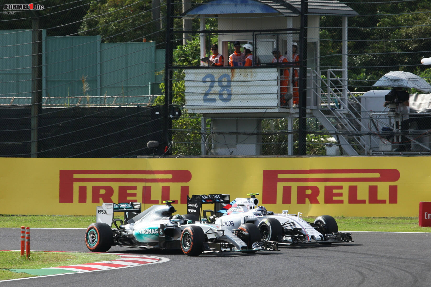 Im Kampf um Platz drei kommt Bottas vier Runden vor Rosberg zum ersten Boxenstopp und verhindert so einen "Undercut". Aber auf der Strecke kann er sich nicht lange wehren. Rosbergs Manöver in der Schikane lobt sogar Mercedes-Sportchef Toto Wolff später als "großartig". Dabei wird der Deutsche am Funk immer wieder ermahnt, auf die Temperatur seiner Antriebseinheit zu achten.