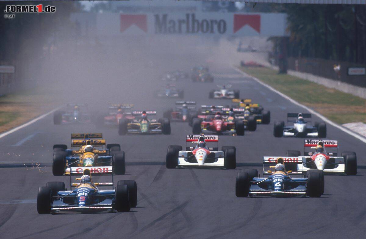 Während Ayrton Senna auch im Qualifying zum Grand Prix von Mexiko 1992 einen heftigen Crash - diesmal in der Esses-Passage vor der Gegengerade - unverletzt übersteht, schreibt das Rennen zwei Geschichten. Die erste ist der überlegene Start-Ziel-Sieg von Nigel Mansell. Der Brite gewinnt vor Williams-Teamkollege Nigel Mansell, während dahinter ...