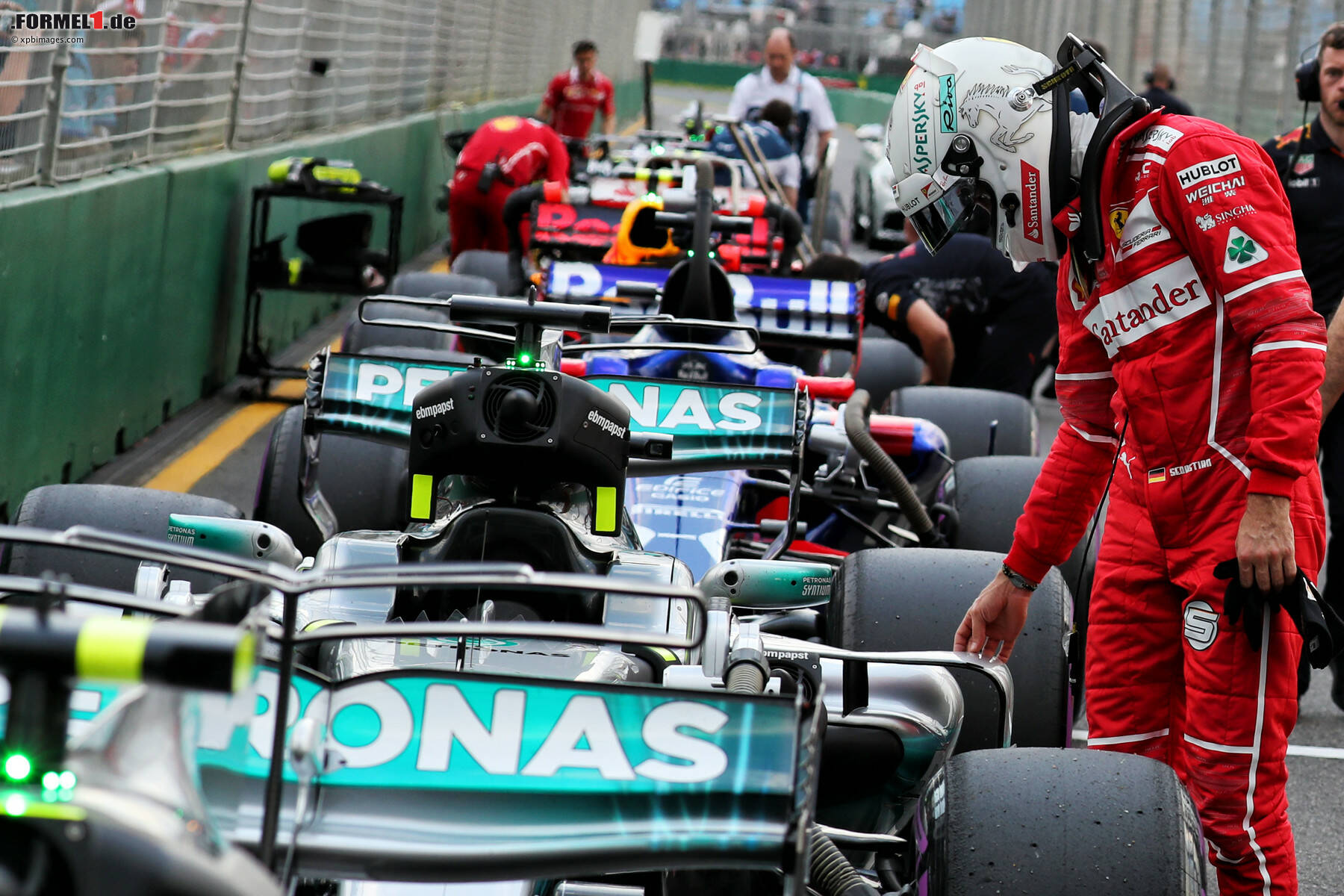 Frechheit siegt! Sebastian Vettel scheut nach dem Qualifying nicht davor zurück, die Konkurrenz-Boliden zu berühren und wird von Lewis Hamilton zur Rede gestellt