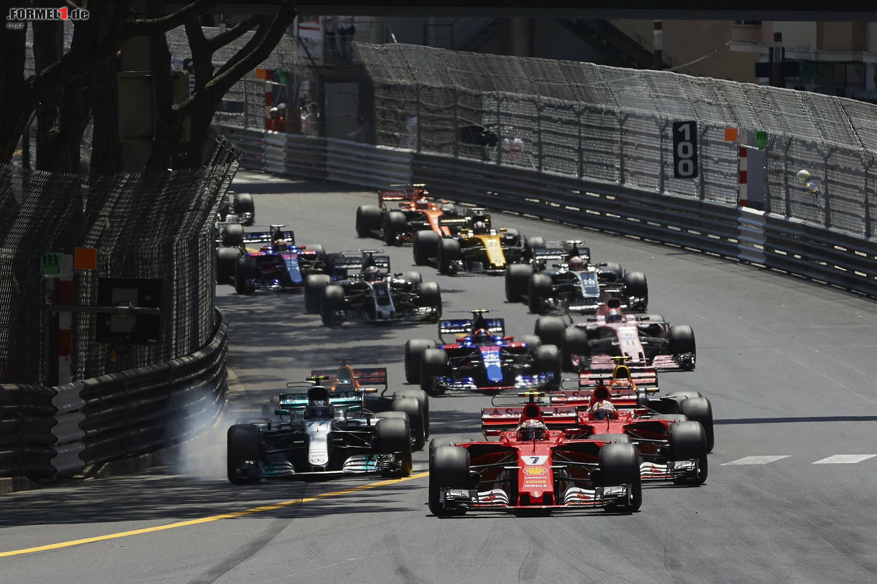 Weil nur ein Boxenstopp erwartet wird, kommt dem Start besondere Bedeutung zu. Räikkönen meistert die Aufgabe souverän und behauptet die Führung vor Vettel. Bottas kommt am besten weg, muss aber vor Sainte Devote zurückstecken. Auf den ersten acht Plätzen gibt es keine Positionsveränderungen.