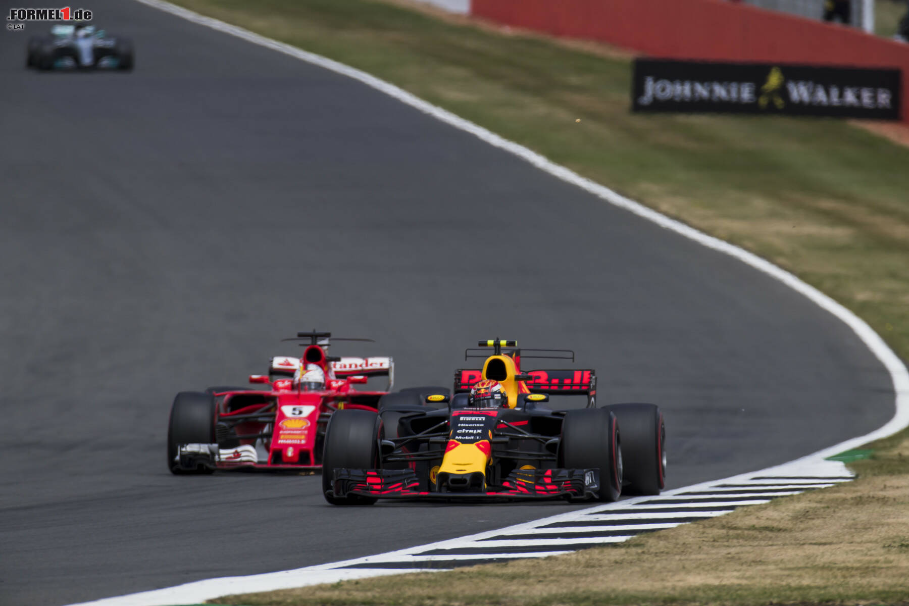 In der 13. Runde reißt Vettel der Geduldsfaden: Weil sein Rückstand auf Hamilton auf über zehn Sekunden angewachsen ist, schert er vor Stowe neben Verstappen aus ...