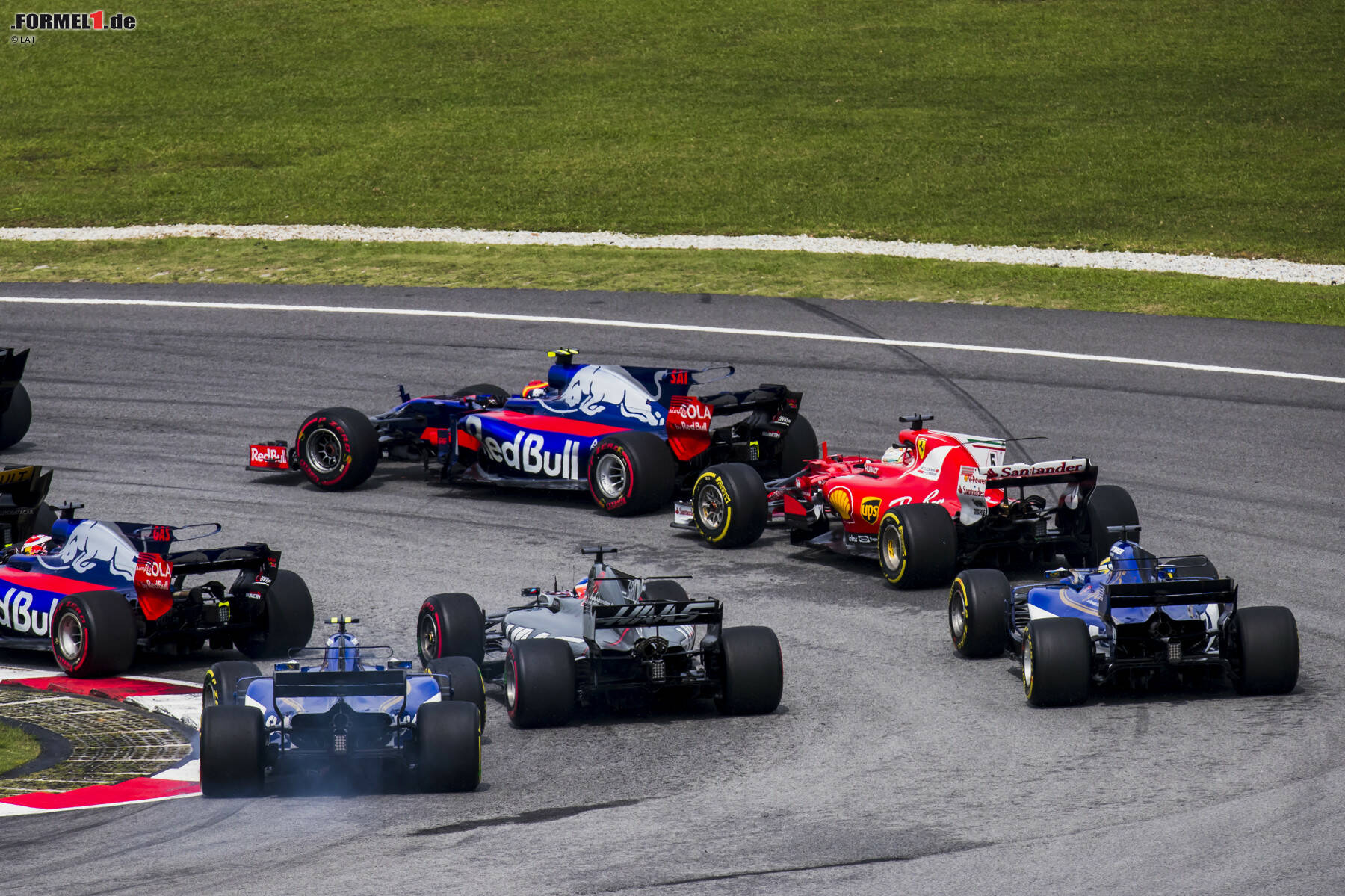 Pechvogel Vettel (Galgenhumor: "Zumindest haben wir die meisten frischen Reifen") schiebt sich in der ersten Runde von ganz hinten auf P12. Wie vorhergesagt ist das hintere Mittelfeld für ihn nur Kanonenfutter. Glück hat er aber, als er sich an einem Toro Rosso beinahe den Frontflügel abrasiert.