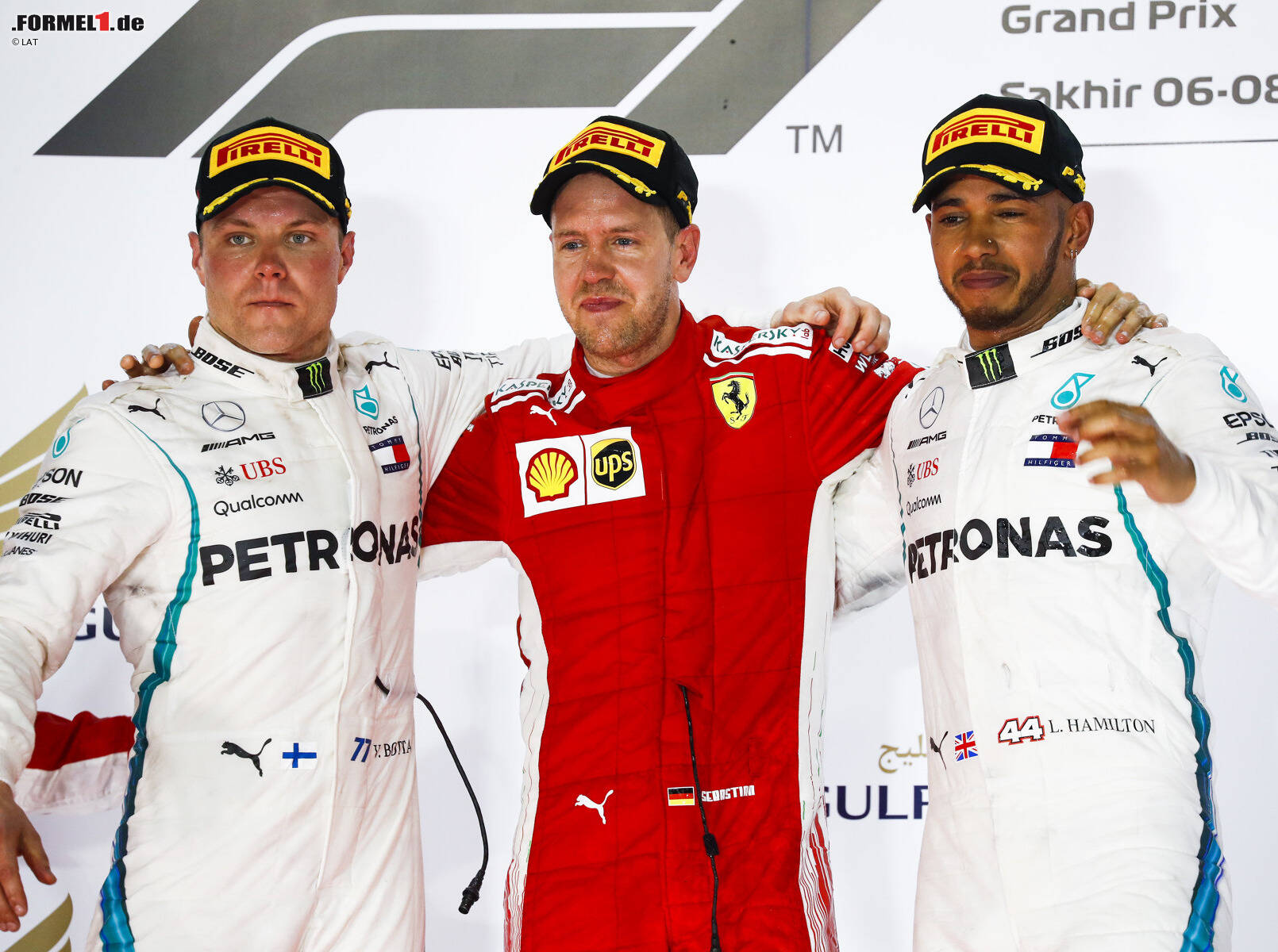 (Motorsport-Total.com) - Sebastian Vettel hat beim Grand Prix von Bahrain in Sachir/Manama seinen zweiten Saisonsieg gefeiert. In einem in der Schlussphase dramatischen Rennen gewann der Ferrari-Star 0,699 Sekunden vor Valtteri Bottas und Lewis Hamilton (beide Mercedes) und baute damit seine WM-Führung vor Hamilton auf 17 Punkte aus.