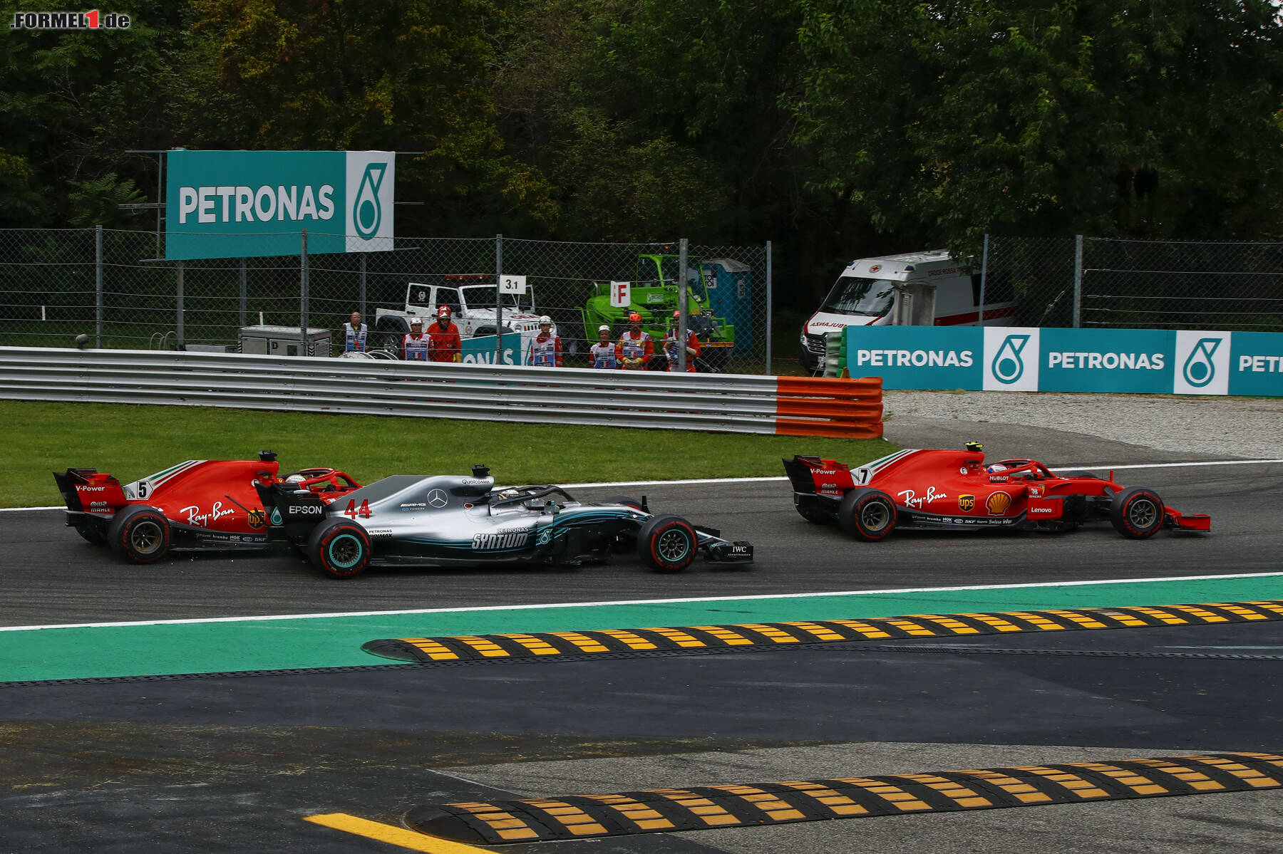 Hamilton hatte zwar schon vor der ersten Schikane guten Windschatten, riskierte dort aber keine Attacke. Durch die schnelle Curva Grande hatte er dann mehr Schwung als Vettel, und während Vettel beim Anbremsen der Rettifilo Räikkönen vor der Nase hatte, hatte Hamilton auf der rechten Fahrbahnseite genug Platz, um seinen Schwung zu nutzen.