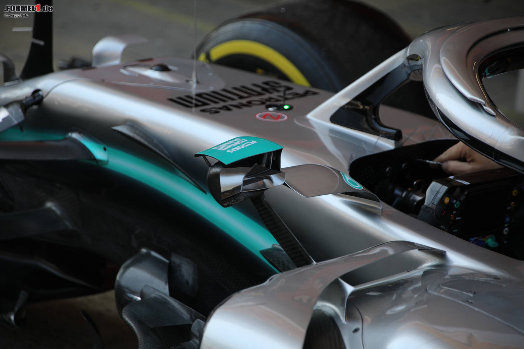 Bei Mercedes gibt es neben den bereits bekannten Updates auch einen neuen Frontflügel. Hier folgt man der Richtung von Red Bull. Der oberste Flap wurde etwas getrimmt, um im vierten Element einen kleinen Einschnitt zu ermöglichen.