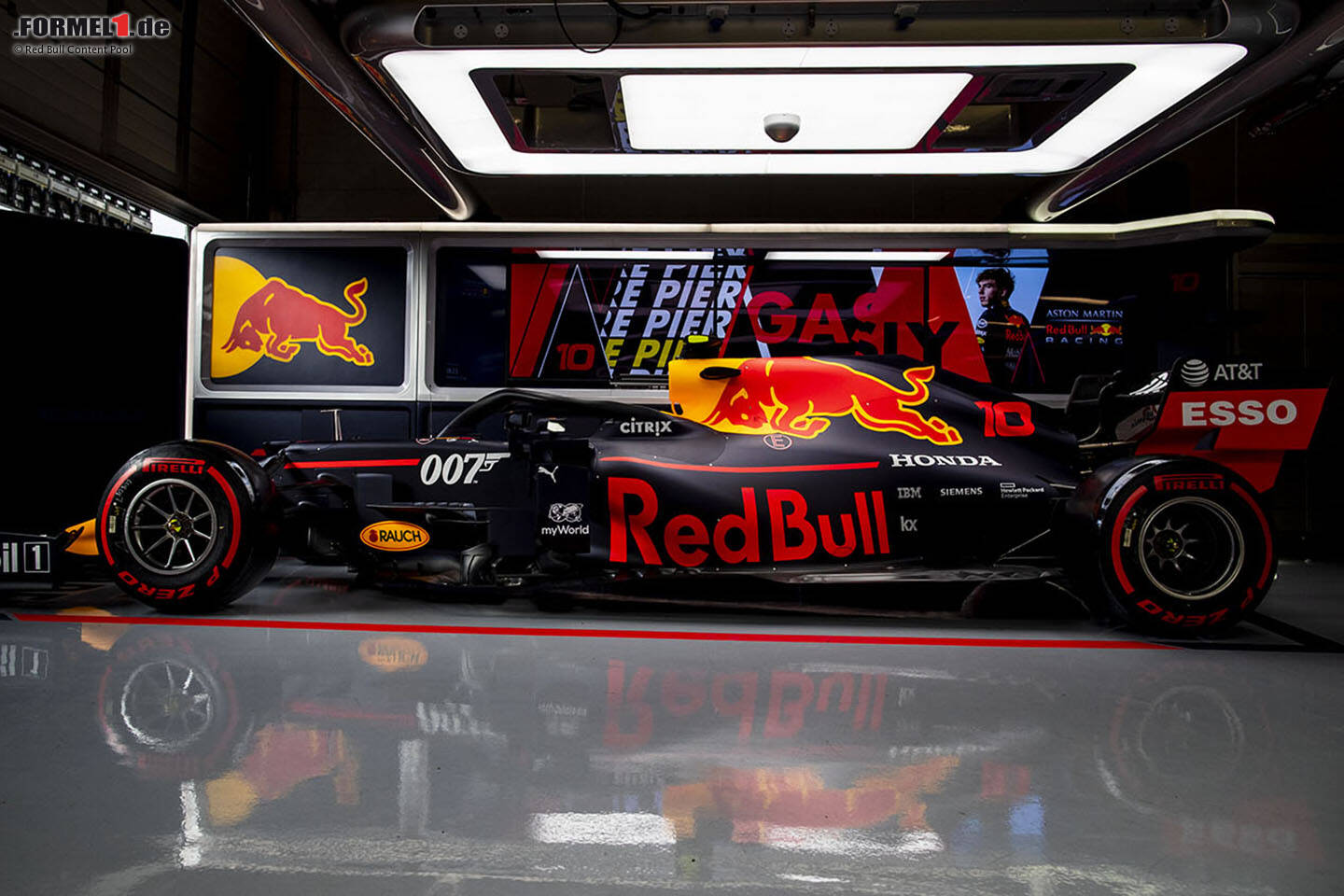 (Motorsport-Total.com) - Red Bull packt mal wieder eine Speziallackierung aus. Am Wochenende werden die Bullen den RB15 im James-Bond-Design an den Start schicken. So wird das berühmte 007-Logo groß auf dem Heckflügel und auch an der Seite des Autos zu sehen sein. Zudem soll die Box der Bullen in Silverstone an das MI6-Labor von Q angelehnt sein.