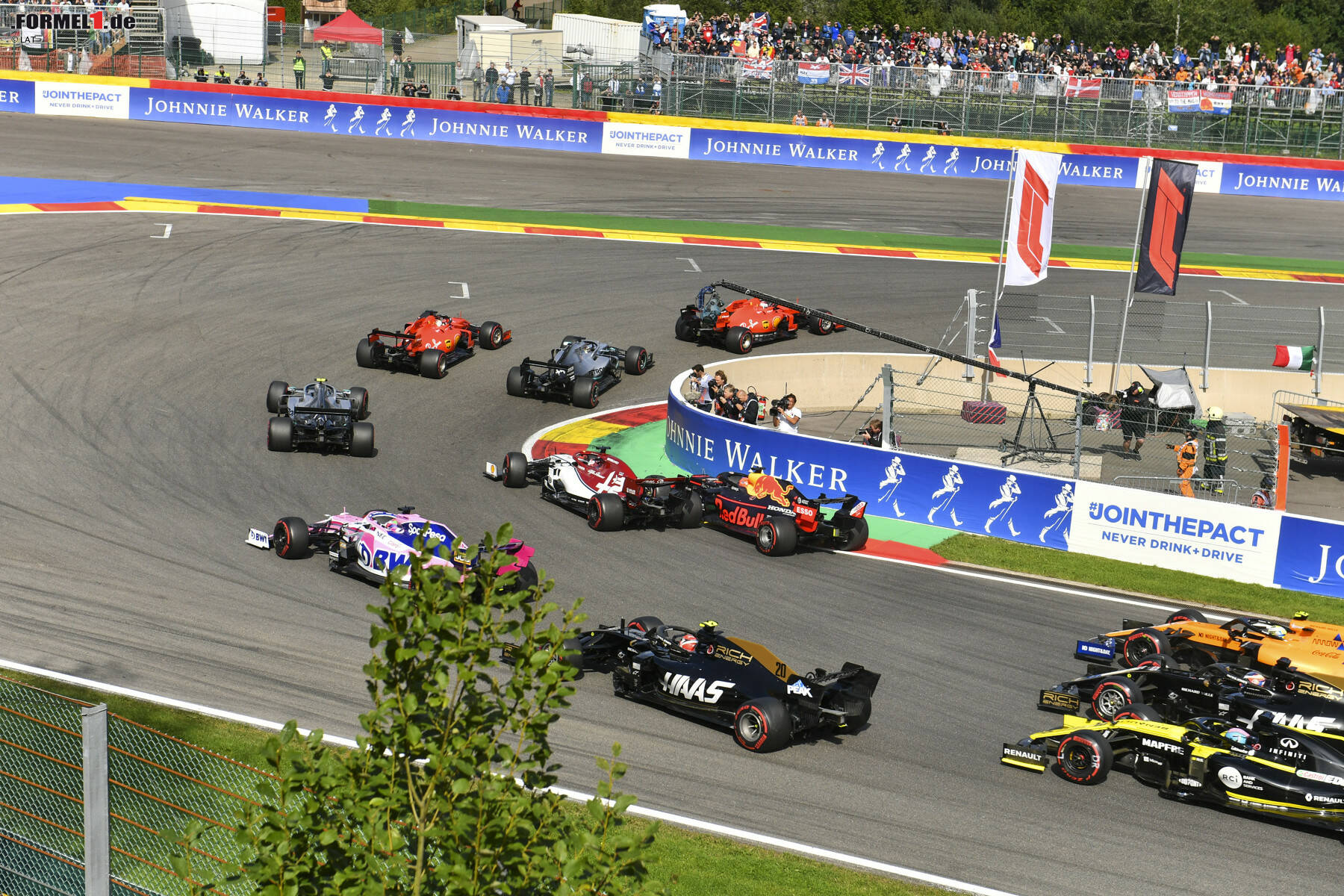 Der Red Bull des Niederländers erlitt durch den Zwischenfall links vorne eine Beschädigung an der Radaufhängung. Zwar fuhr Verstappen noch weiter, nach Eau Rouge bergauf konnte er aber nicht mehr einlenken. Die Radaufhängung brach und er krachte geradeaus in die Reifenstapel. Das Rennen war für den Publikumsliebling bereits vorbei. Das Safey Car kam auf die Strecke.